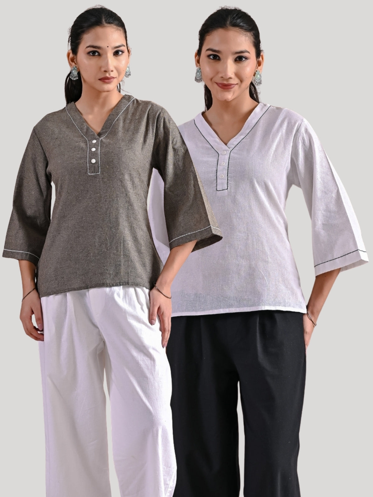 Pack Of 2 Biscuit And White Handloom Cotton Anchor Thread Designer Tops