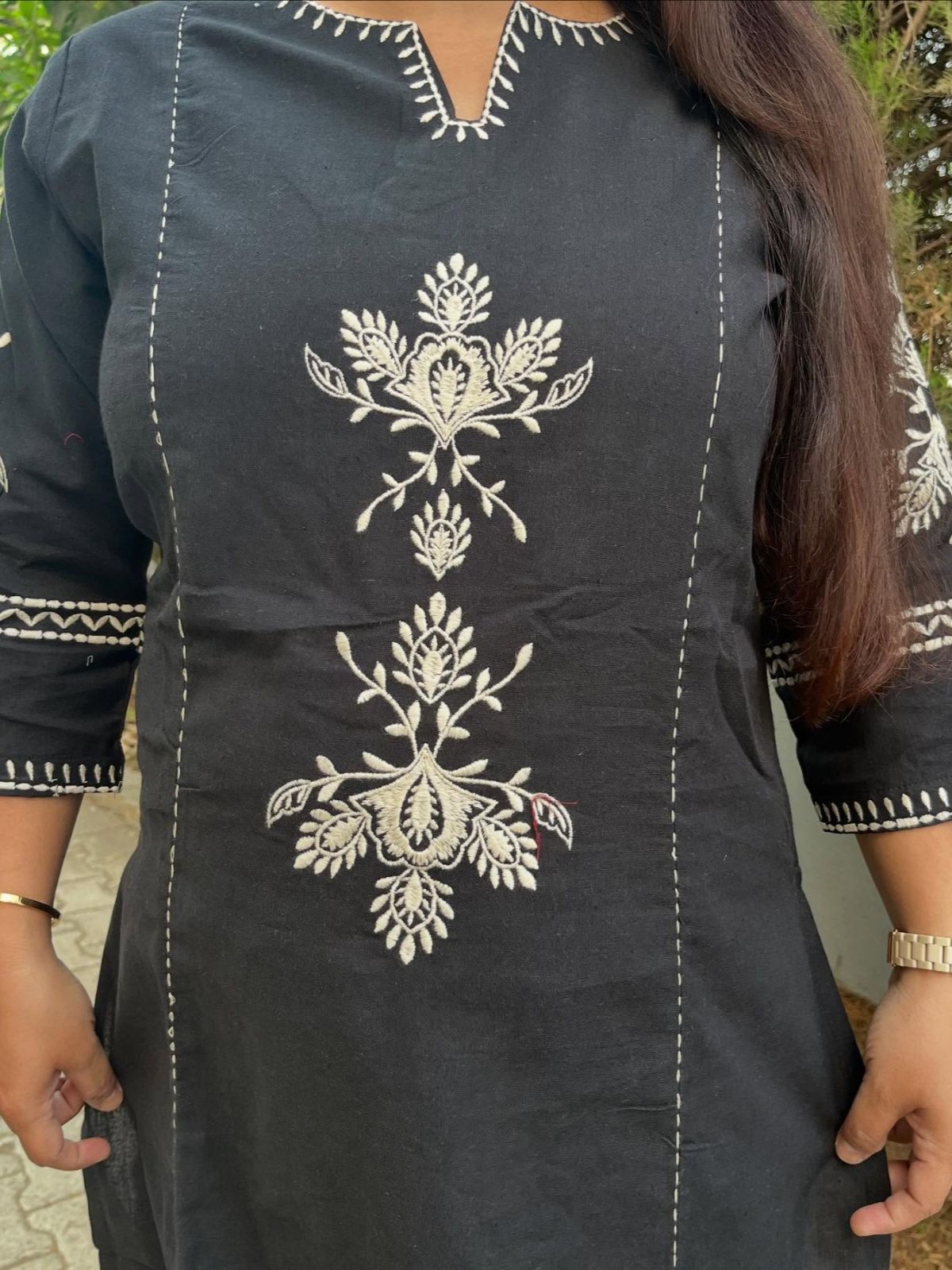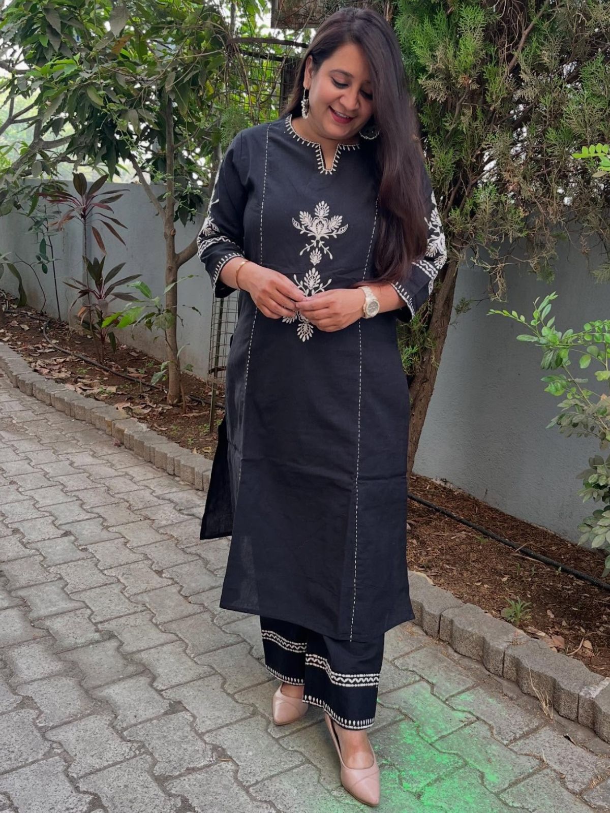 Designed for comfort and effortless style, this women's embroidery cotton kurta pant set will help you discover timeless elegance. The kurta has a lovely round neck that elegantly shapes into a subtle V-shape for a perfected appearance, and it has delicate embroidery work on soft, breathable cotton fabric. The top dress elevates your ethnic wardrobe with its full-length design and fashionable 3/4 sleeves. Made from the same high-quality cotton, the matching pants have a full-length silhouette and a fully elasticated waistband for a snug and comfortable fit throughout the day. This kurta set blends traditional charm with contemporary comfort, making it ideal for everyday wear or festive occasions. It is a must-have for any woman's wardrobe.