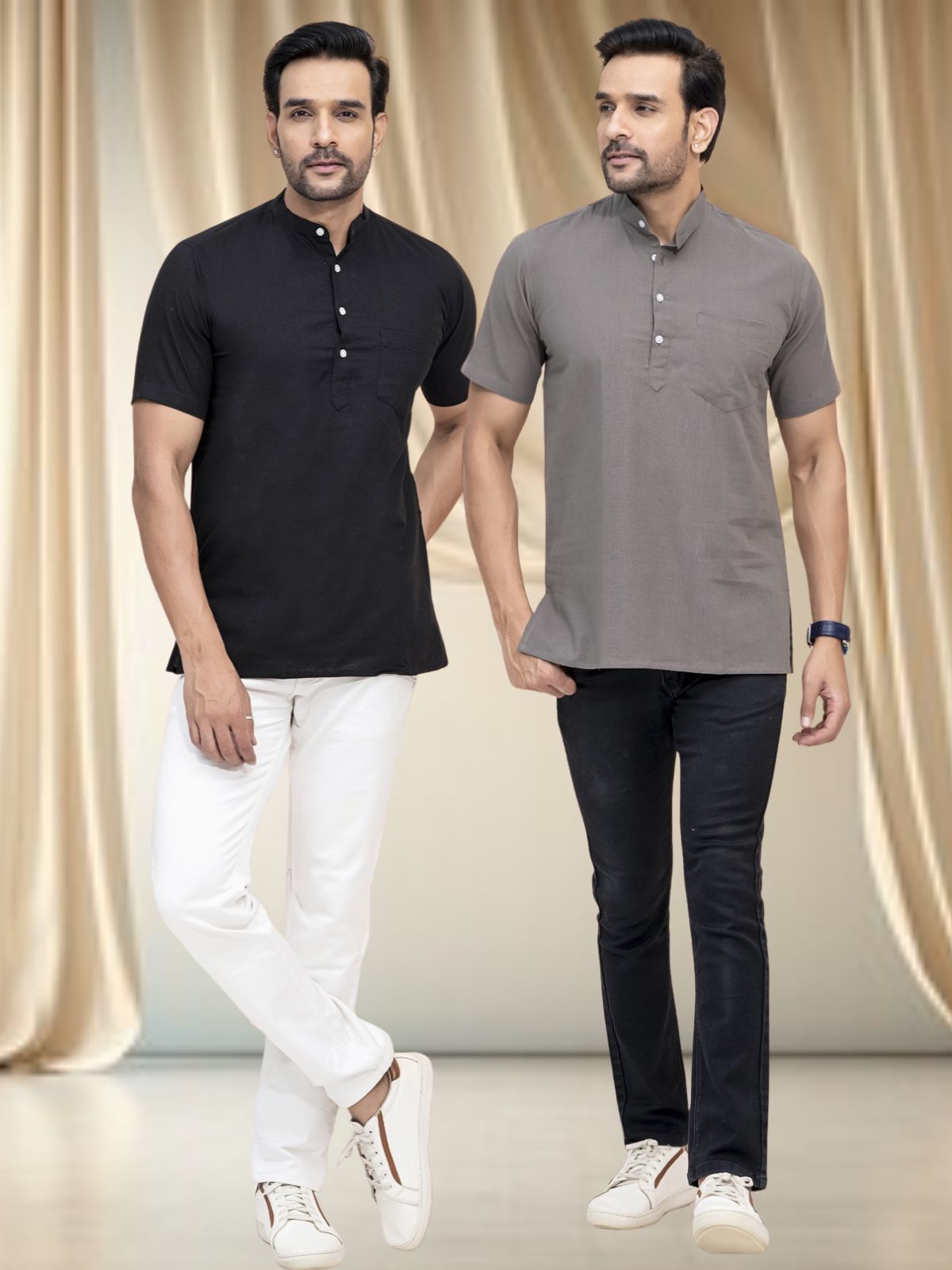 Pack Of 2 Mens Black And Grey Cotton Short Kurta Combo