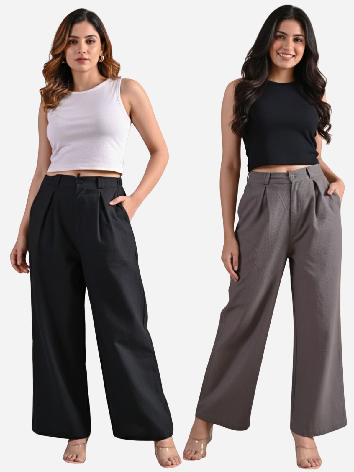 Pack Of 2 Black And Grey Women Cotton Wide Leg Pants