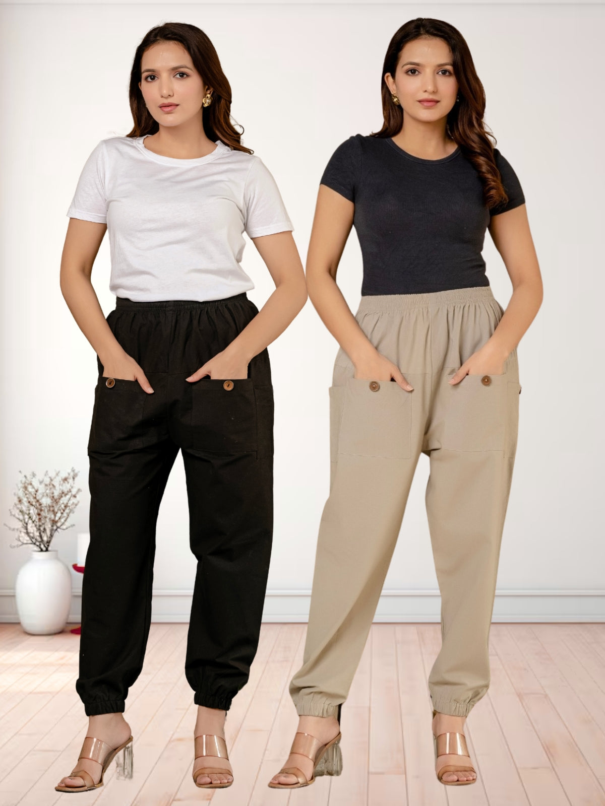 Quaclo's Combo Pack Of Womens Four Pocket Cotton Cargo Pants will amaze you with its unmatched comfort and style. The softness and breathability of these flexible cargo pants are precisely constructed from the finest pure cotton. While the fully elastic waistband guarantees a perfect fit and extra flexibility, the ankle elastic provides a trendy touch and allows you to show off your preferred shoes. Whether you're relaxing at home, heading out or going on an adventure, these cargo pants are your go-to choice. The Pure Cotton Four Pocket Cargo Pants for Women by Quaclo are the perfect combination of fashion and function. Order this essential item right away as feasible to enhance your entire look.