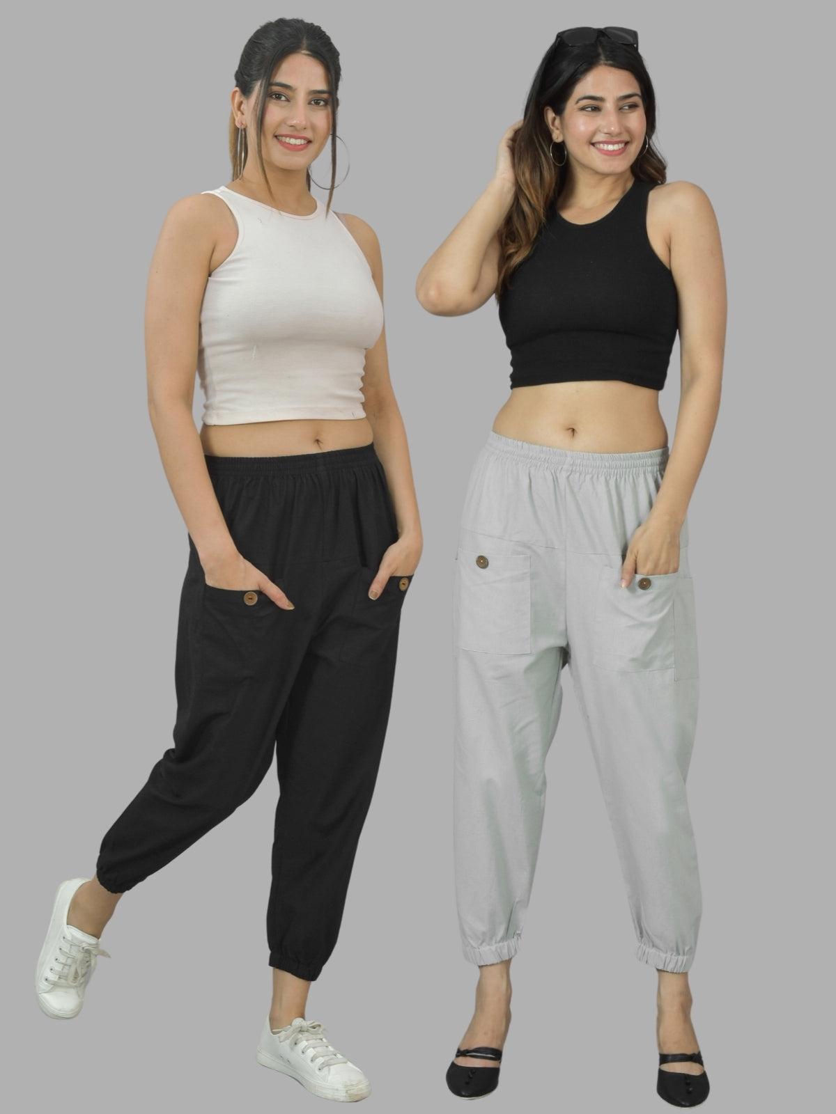 Combo Pack Of Womens Black And Melange Grey Four Pocket Cotton Cargo Pants