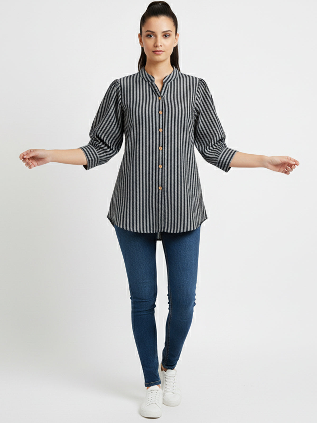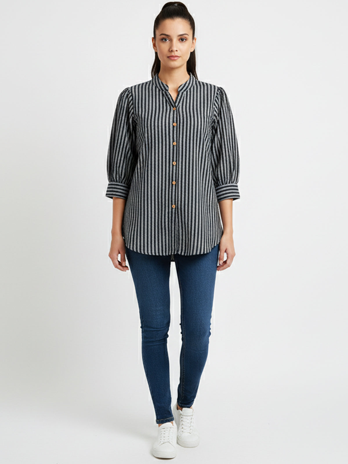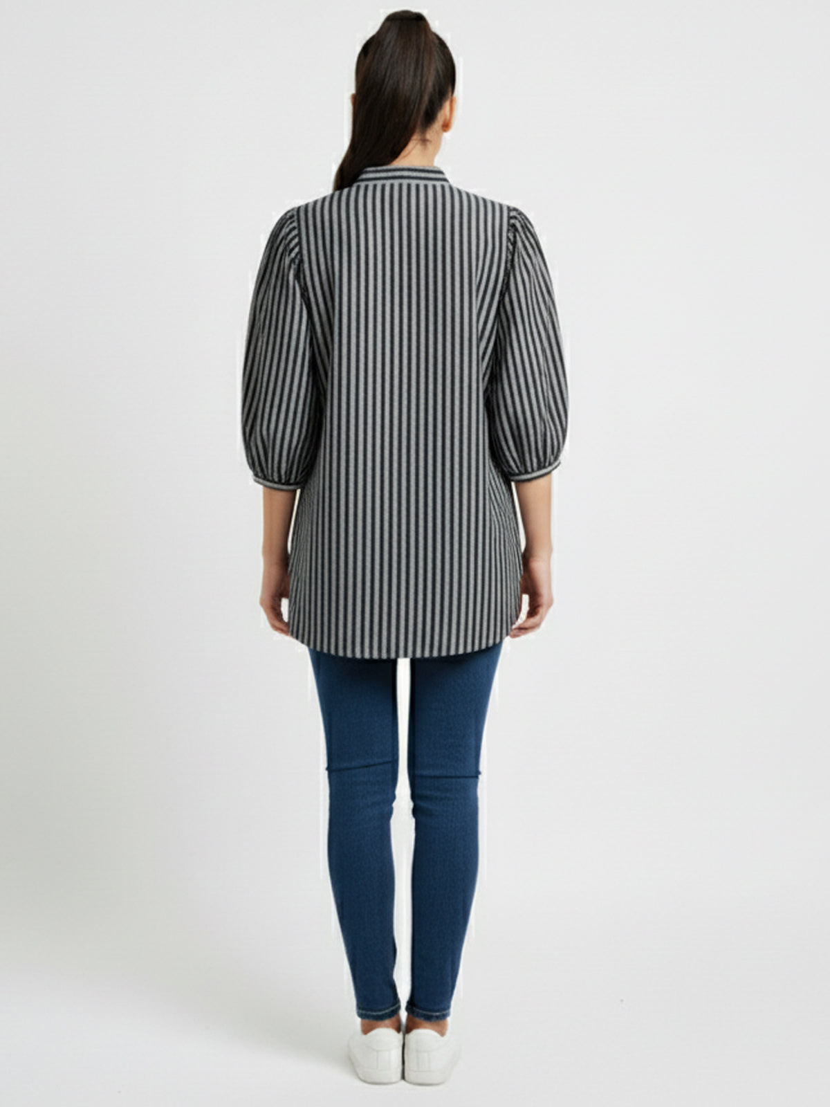 Elevate your everyday style with this elegant women’s vertical striped shirt, designed for both casual and semi-formal wear. Featuring a refined mandarin collar and a half button placket with classic buttons, this top offers a timeless and sophisticated appeal. The shoulder pleated design and stylish 3/4 puff sleeves add a modern, feminine touch while ensuring all-day comfort. Crafted from soft, breathable fabric, it is perfect for work, outings, and seasonal wear. The hip-length fit pairs effortlessly with jeans, trousers, or skirts, making it a versatile wardrobe essential for effortless chic styling.