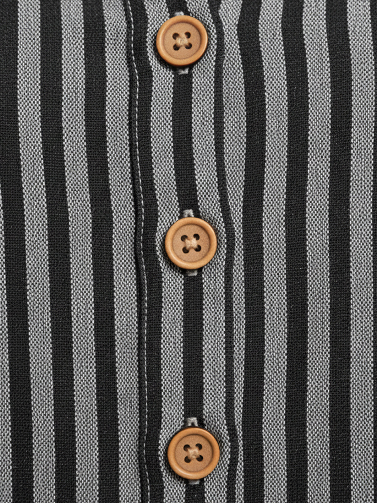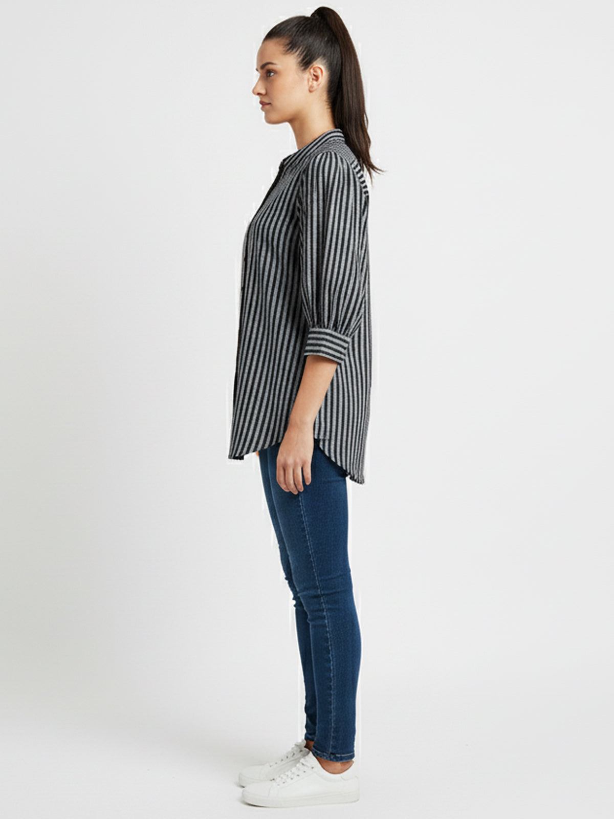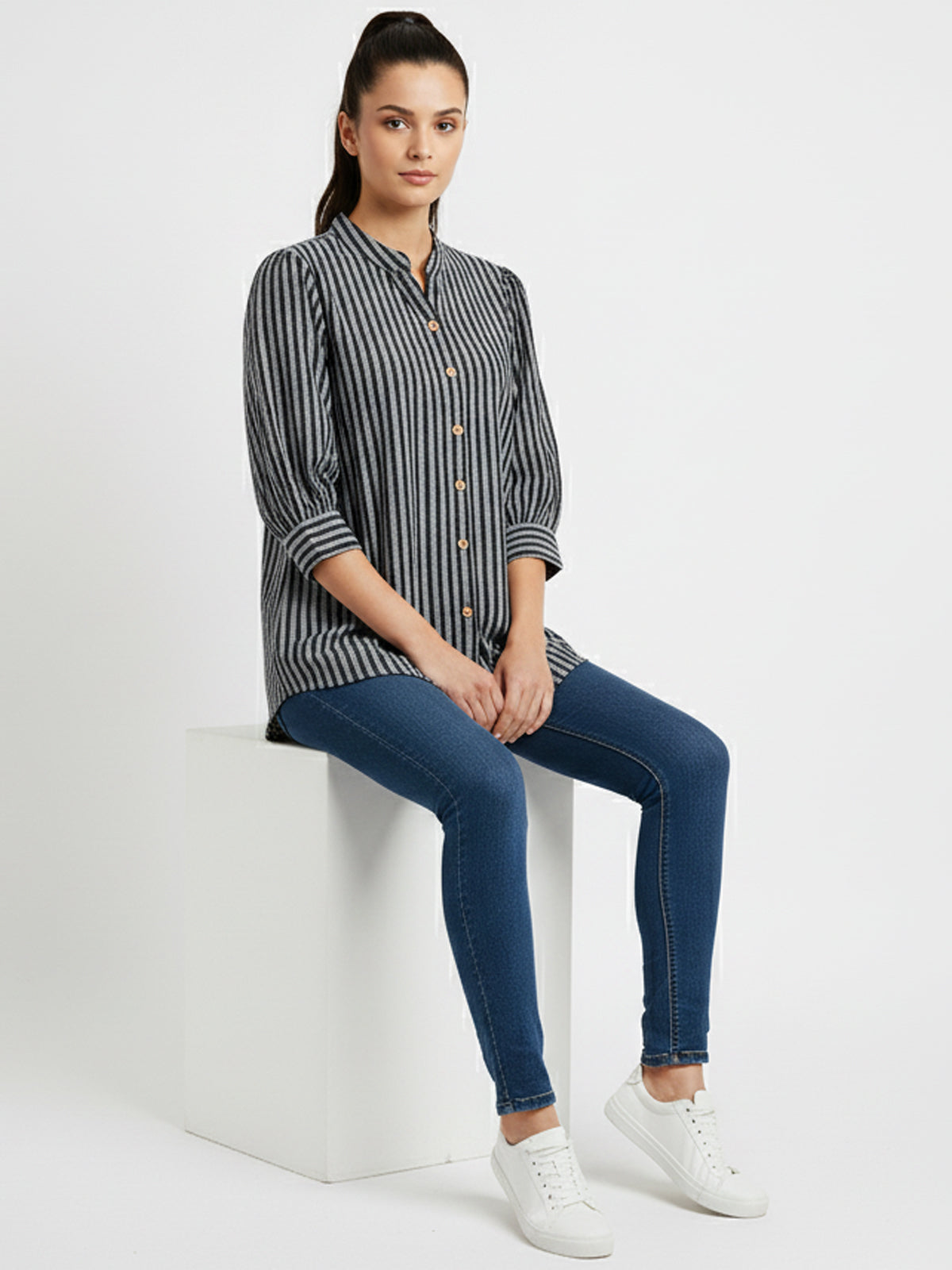 Elevate your everyday style with this elegant women’s vertical striped shirt, designed for both casual and semi-formal wear. Featuring a refined mandarin collar and a half button placket with classic buttons, this top offers a timeless and sophisticated appeal. The shoulder pleated design and stylish 3/4 puff sleeves add a modern, feminine touch while ensuring all-day comfort. Crafted from soft, breathable fabric, it is perfect for work, outings, and seasonal wear. The hip-length fit pairs effortlessly with jeans, trousers, or skirts, making it a versatile wardrobe essential for effortless chic styling.