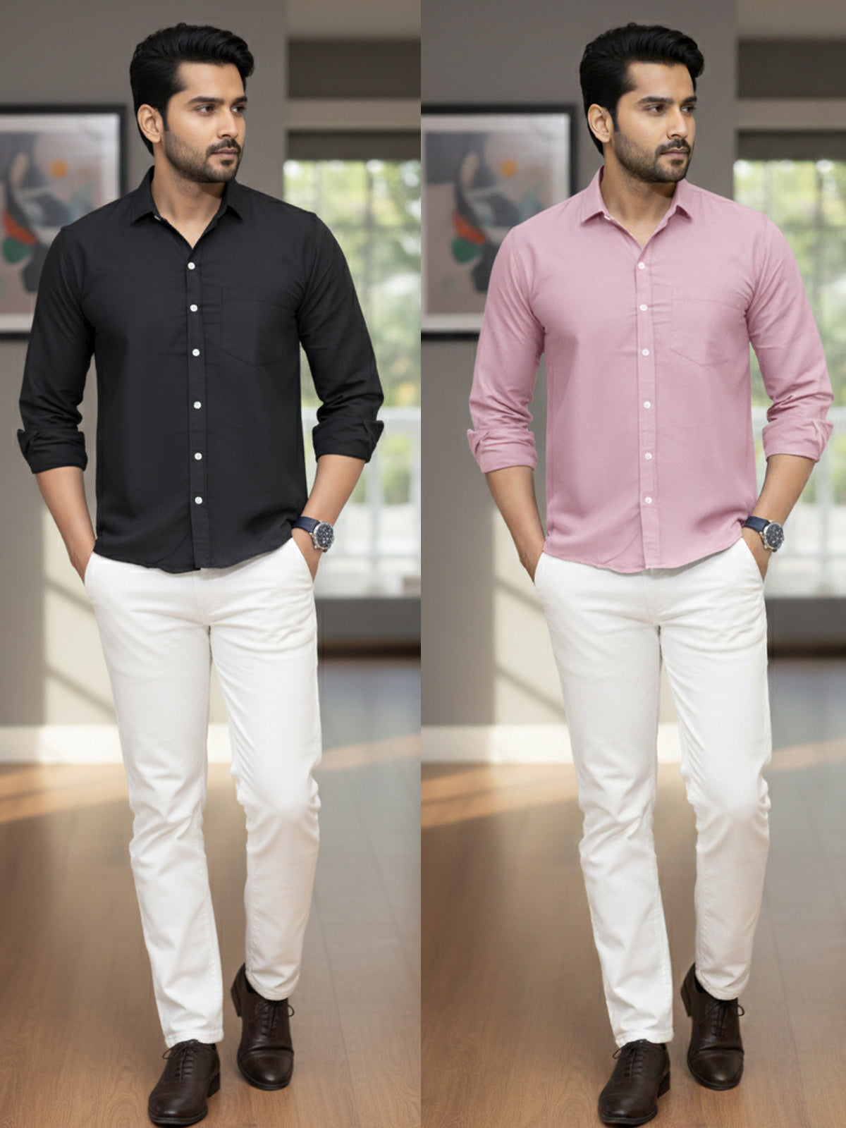 These stylish men's Airy linen shirts Combo with a solid color design will give your outfit a timeless, sophisticated touch. This full-sleeve shirt is perfect for both formal and casual settings because of its durability and all-day comfort. The spread collar adds a sophisticated touch, and the button closure ensures a neat fit. Made from a high-quality linen fabric, this shirt's soft feel and breathability make it ideal for year-round wear. Wear it with pants for a polished office look or jeans for a laid-back weekend outing. This multipurpose shirt is a wardrobe essential for the modern man and is available in a variety of sizes.