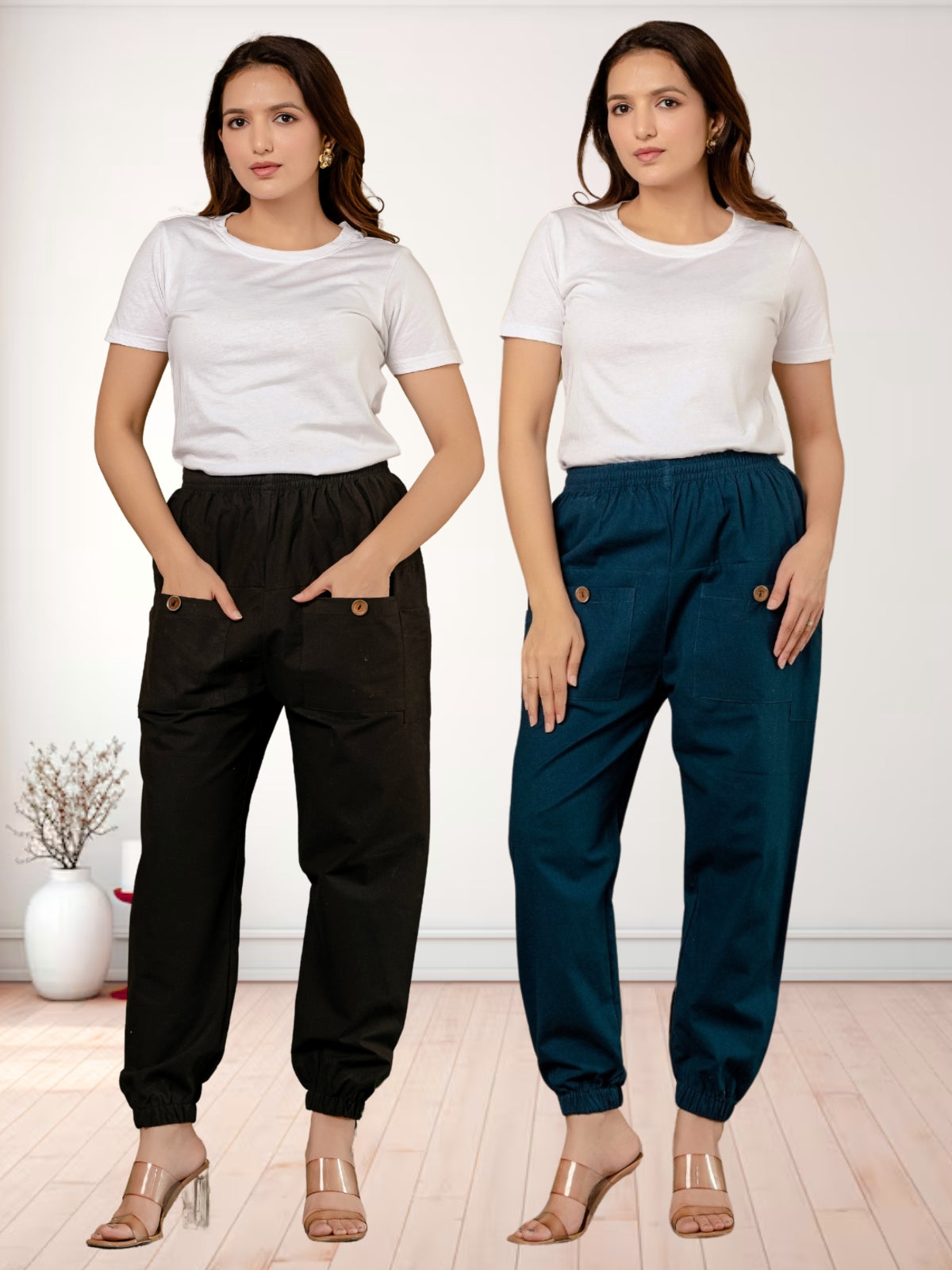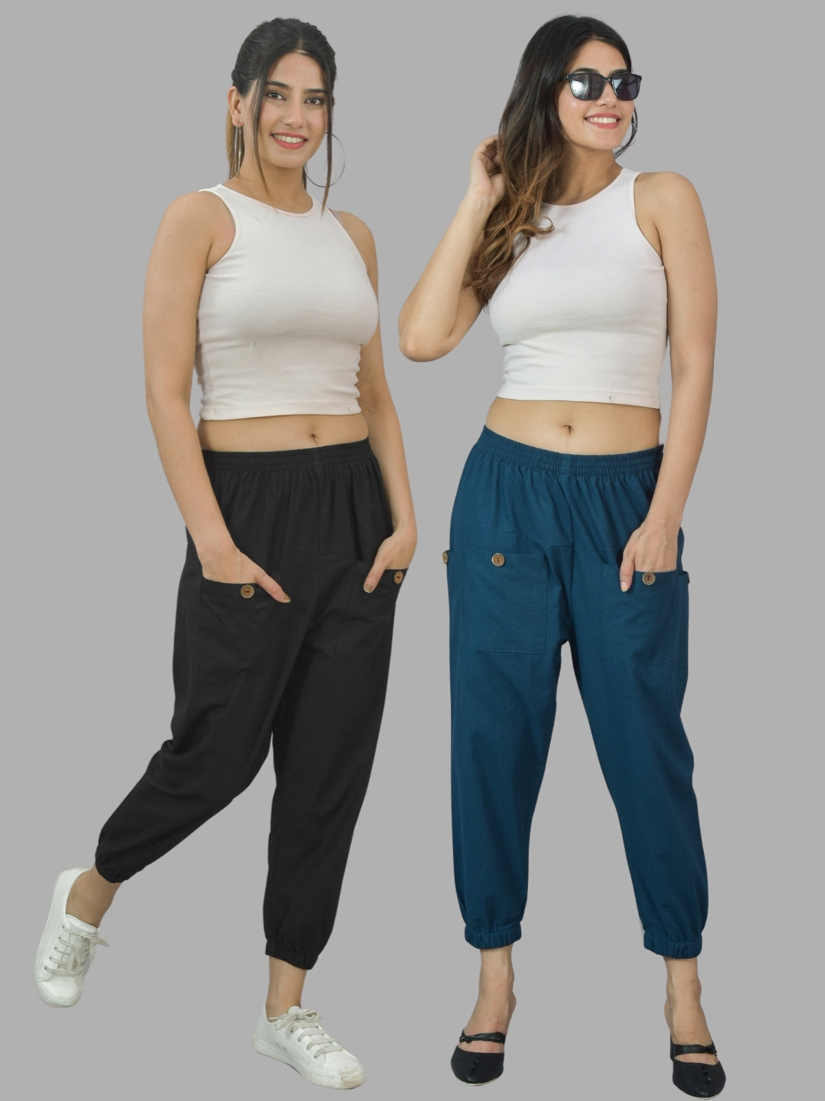Combo Pack Of Womens Black And Teal Blue Four Pocket Cotton Cargo Pants