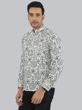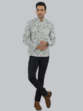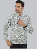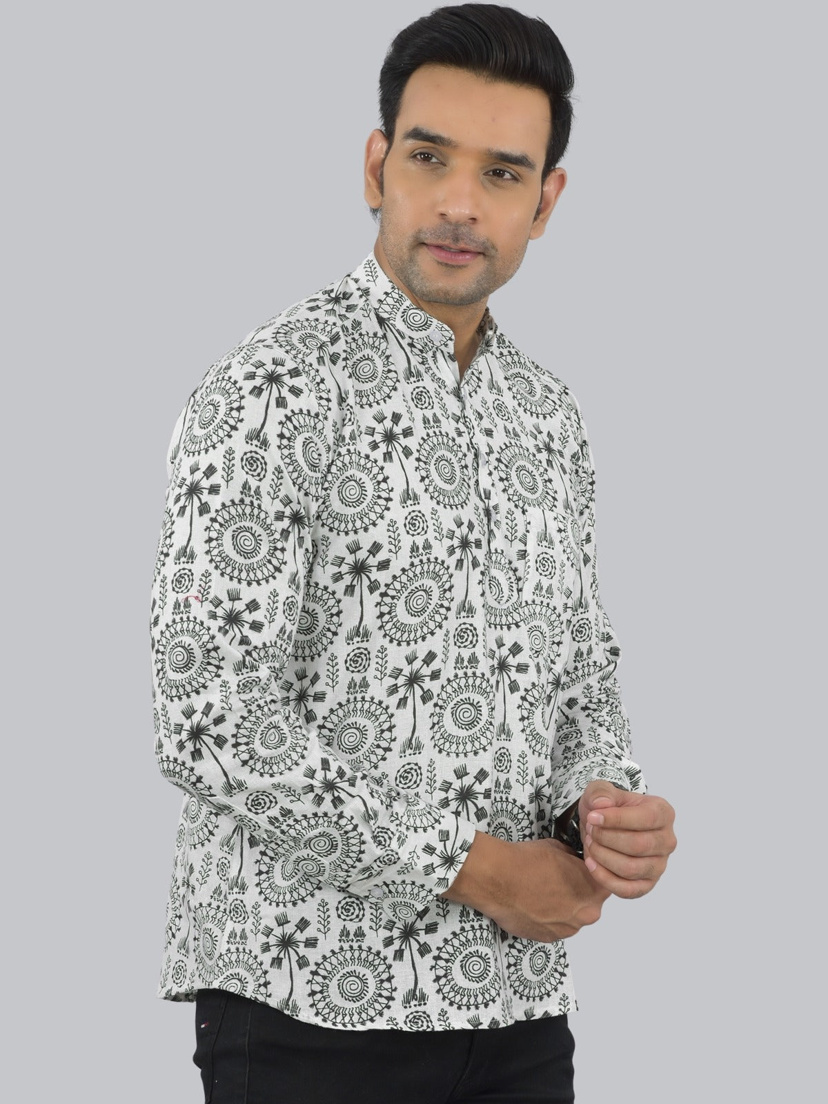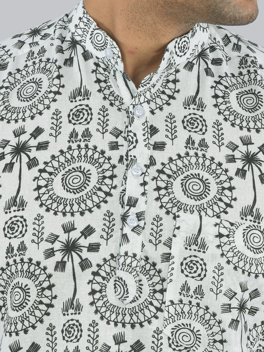 Look fashionable men's printed cotton short kurtas with zigzag, leaf, and tribal patterns. These full-sleeve kurtas are made of breathable cotton and feature a Mandarin collar and button fastening for a stylish yet classic style. Ideal for festive and casual attire.