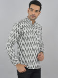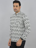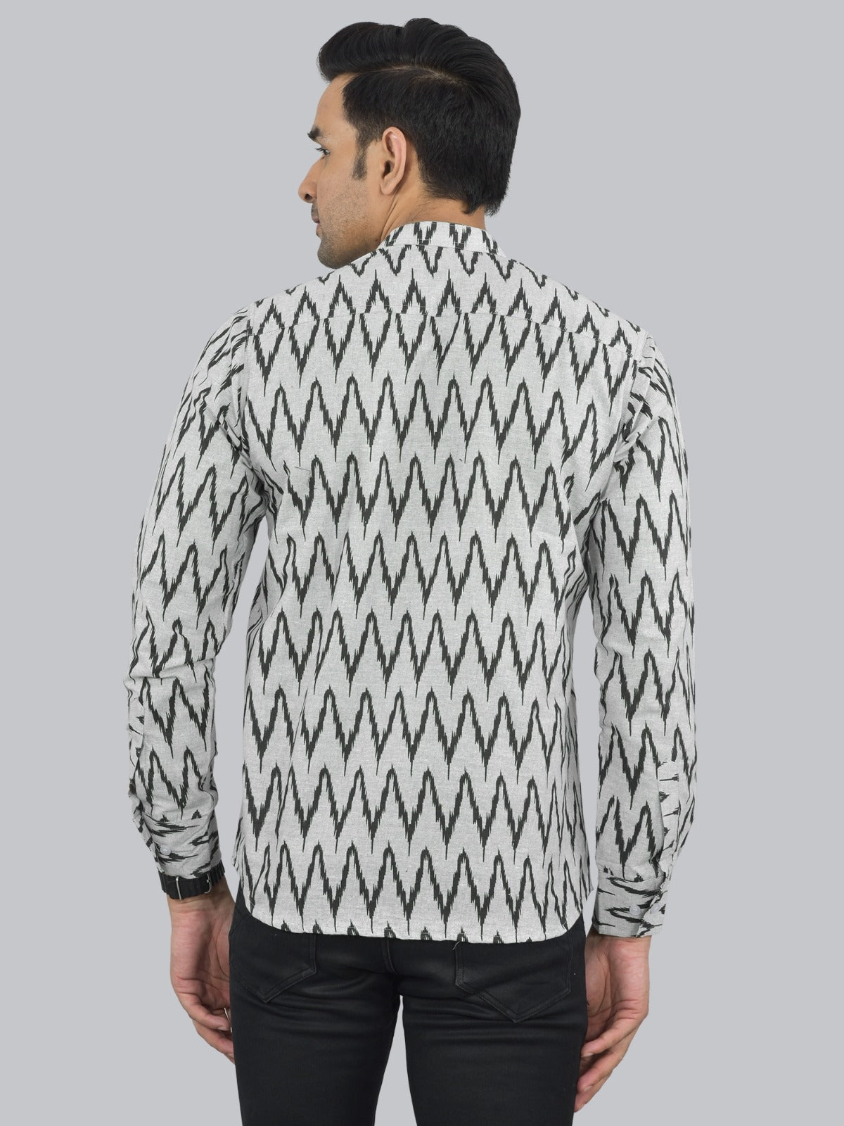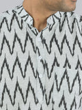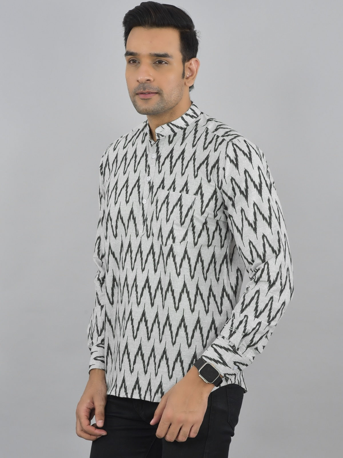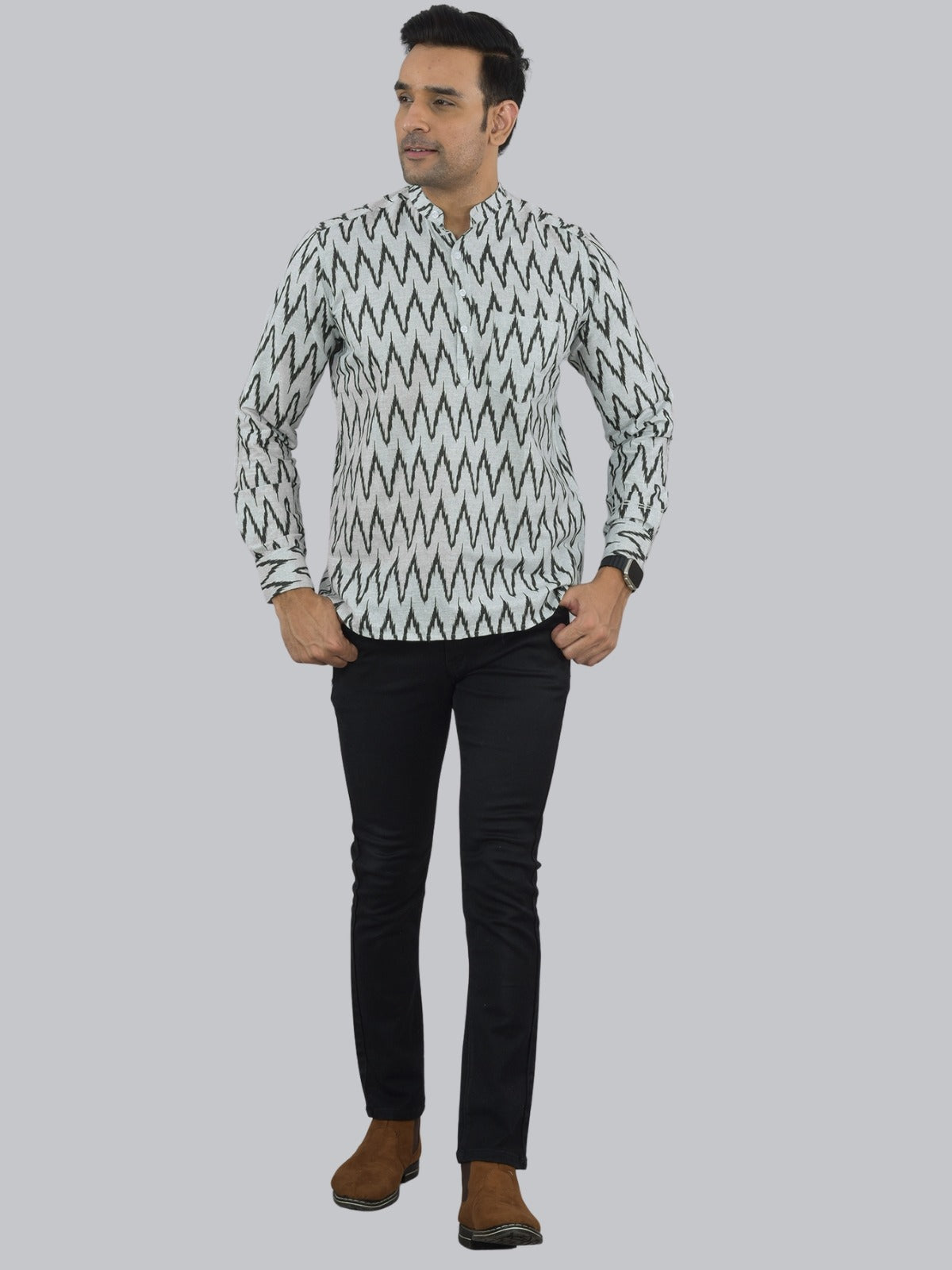 Look fashionable men's printed cotton short kurtas with zigzag, leaf, and tribal patterns. These full-sleeve kurtas are made of breathable cotton and feature a Mandarin collar and button fastening for a stylish yet classic style. Ideal for festive and casual attire.