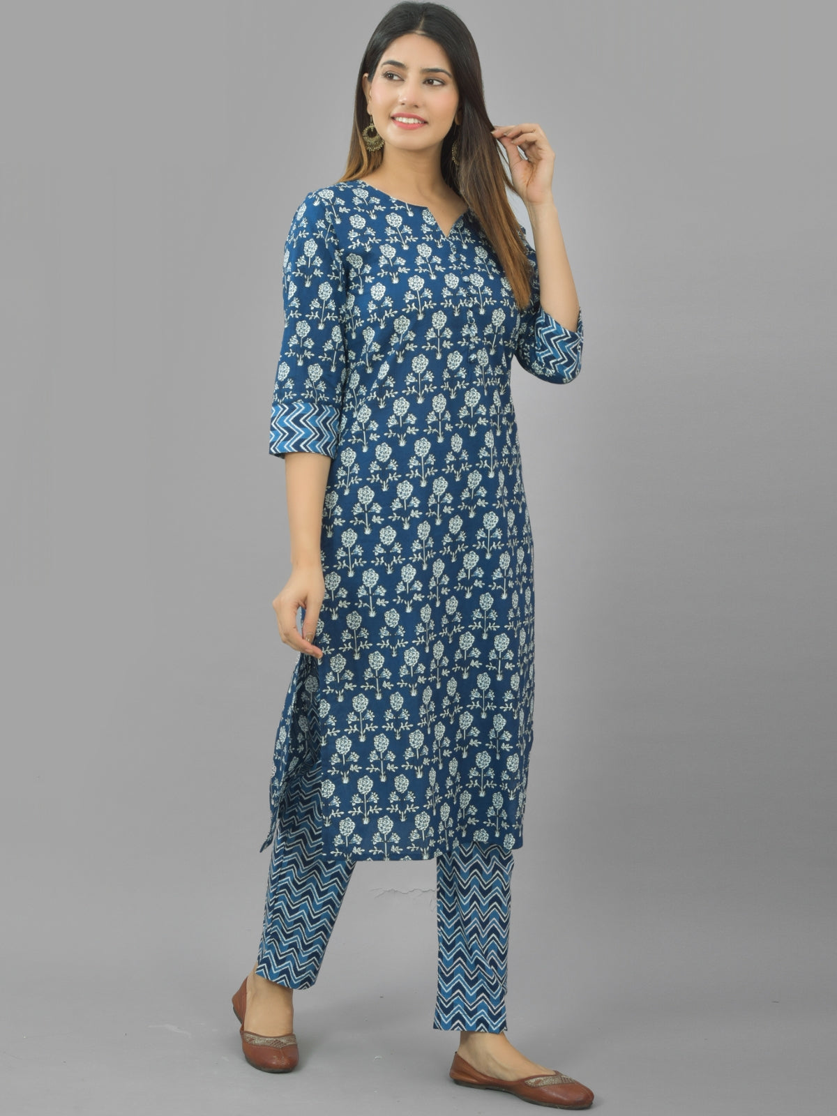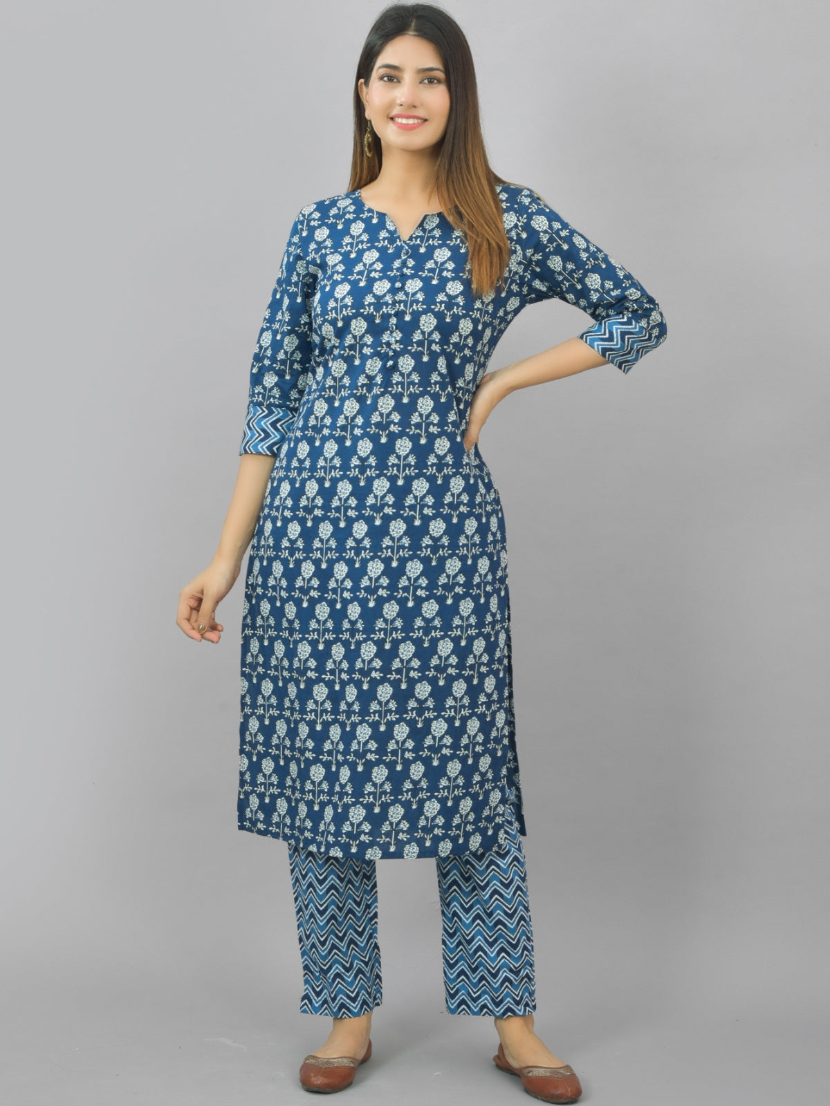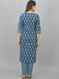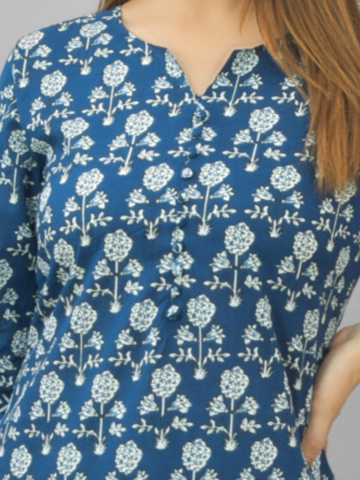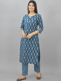 Womens Blue Flower Printed Kurti And Pant Set