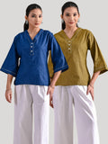 Pack Of 2 Blue And Mustard Handloom Cotton Anchor Thread Designer Tops
