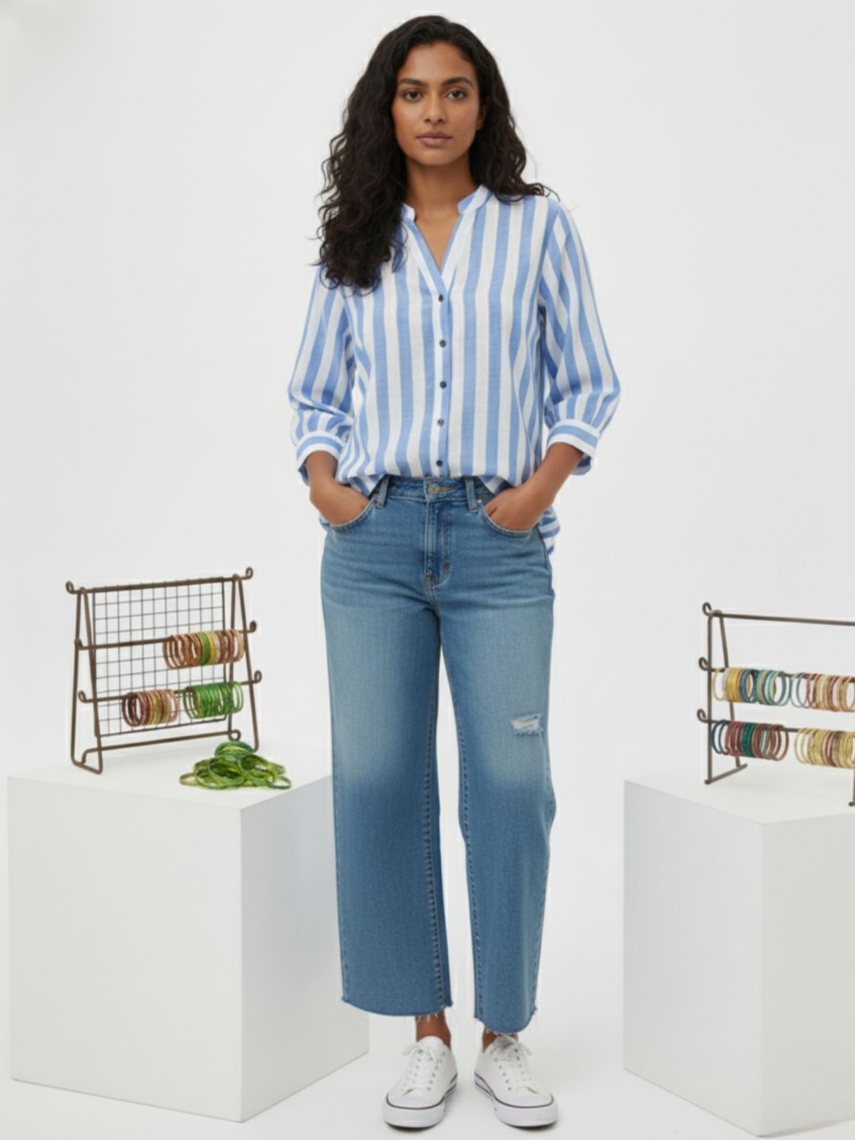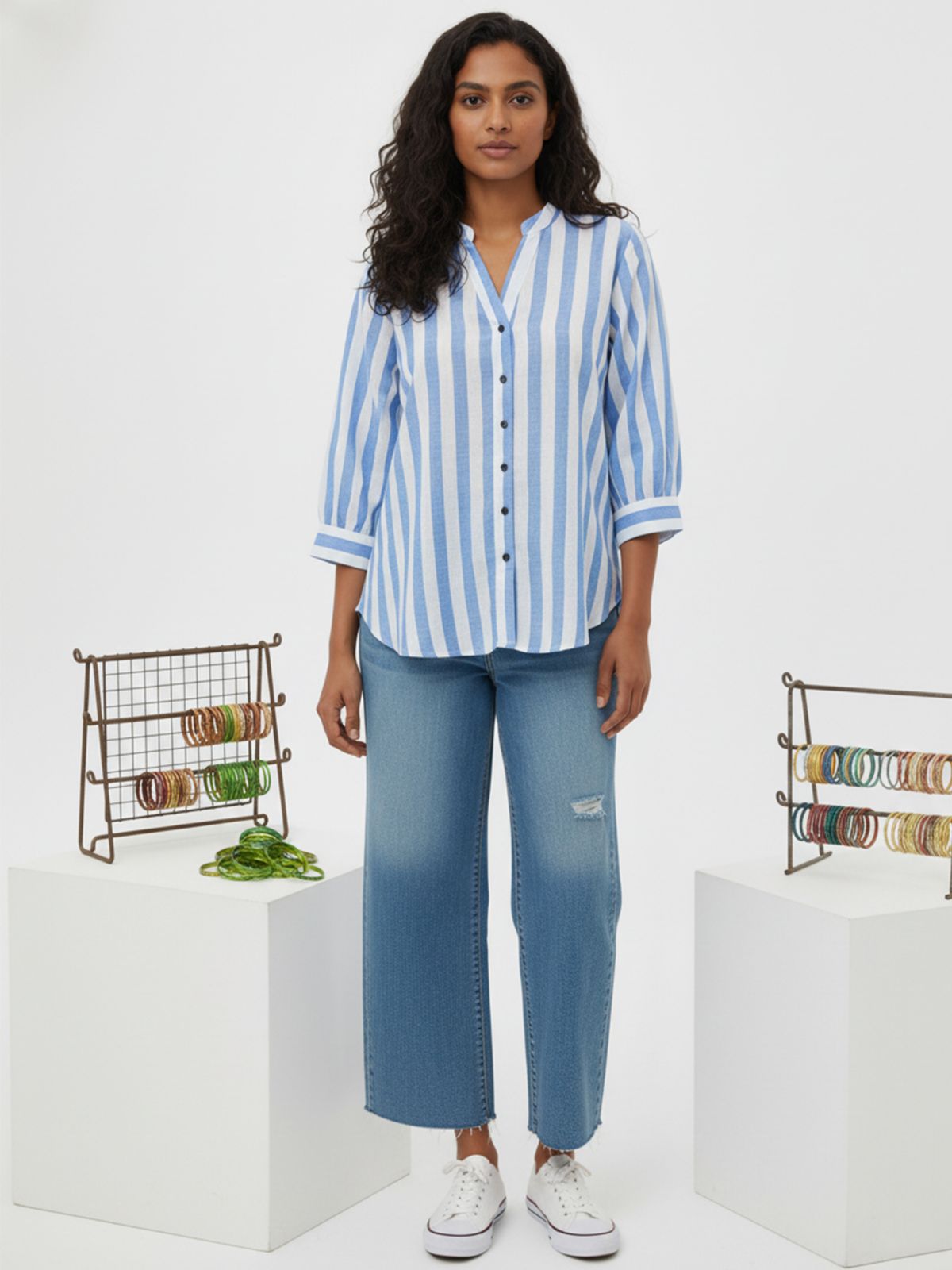 Discover effortless elegance with our Women’s Stripe Shirt featuring stylish shoulder pleats, 3/4th sleeves, and a classic button closure. Designed for both comfort and sophistication, this hip-length shirt offers a flattering fit for any occasion. Crafted from soft, breathable fabric, it blends timeless stripes with modern detailing, making it perfect for office wear or casual outings. Pair it with trousers or jeans for a chic, polished look that enhances your everyday style effortlessly.