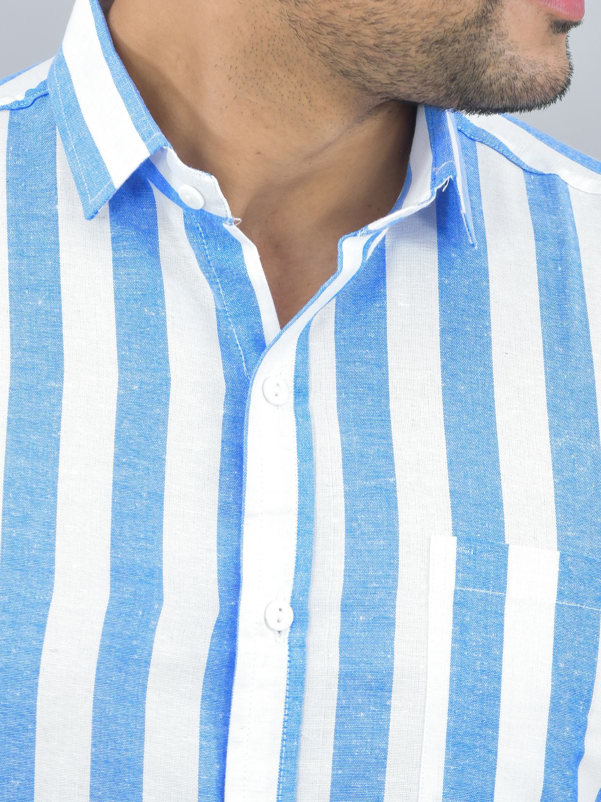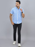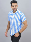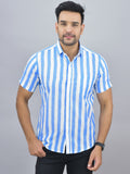 Mens Regular Fit Blue Striped Half Sleeves Cotton Casual Shirt
