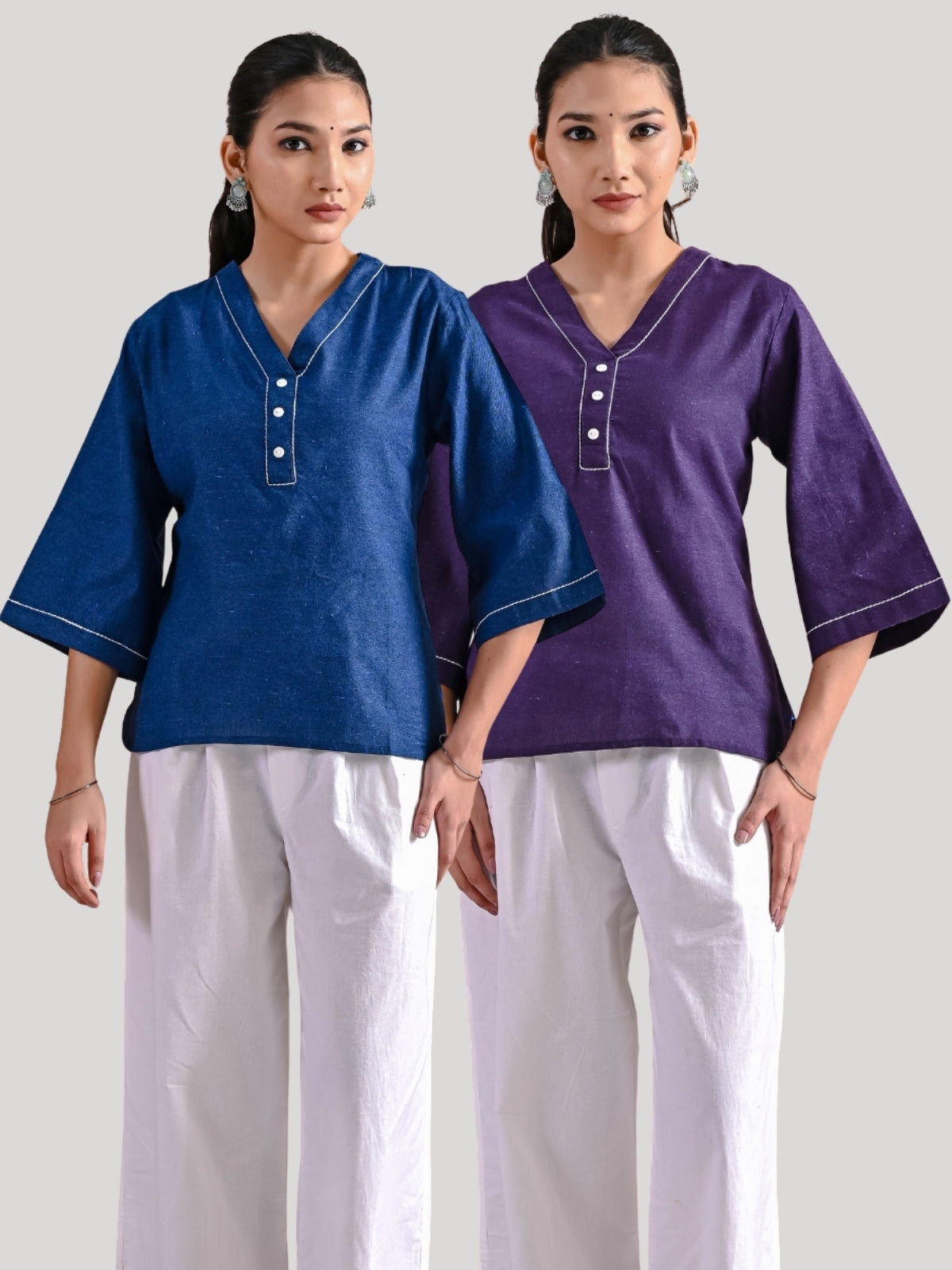 Pack Of 2 Blue And Purple Handloom Cotton Anchor Thread Designer Tops