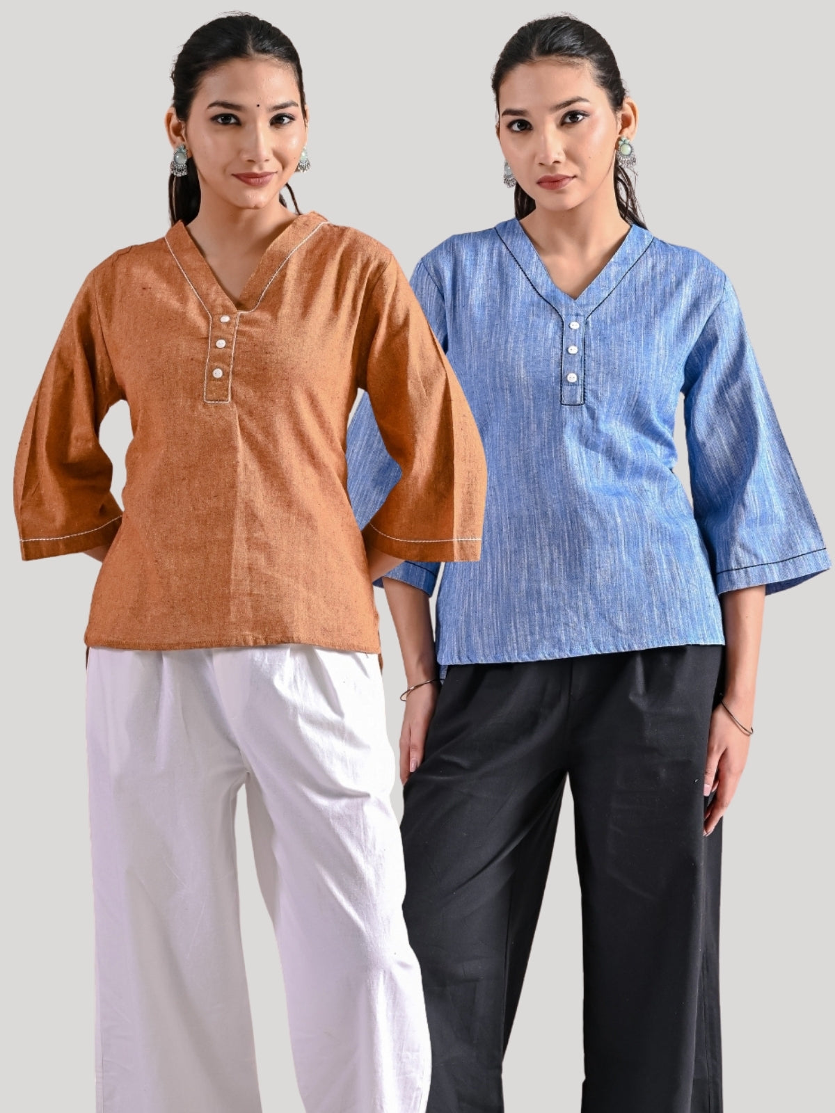 Pack Of 2 Brick Red And Denim Blue Handloom Cotton Anchor Thread Designer Tops
