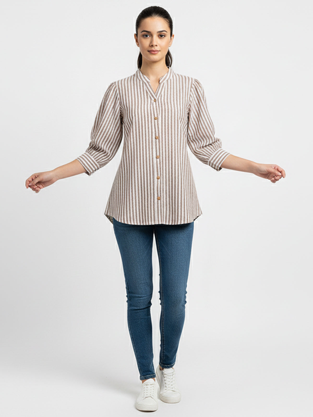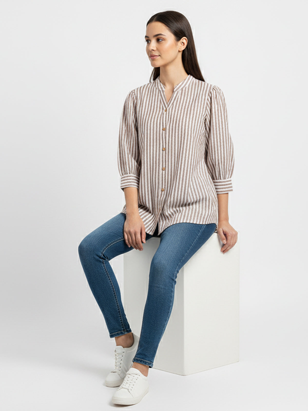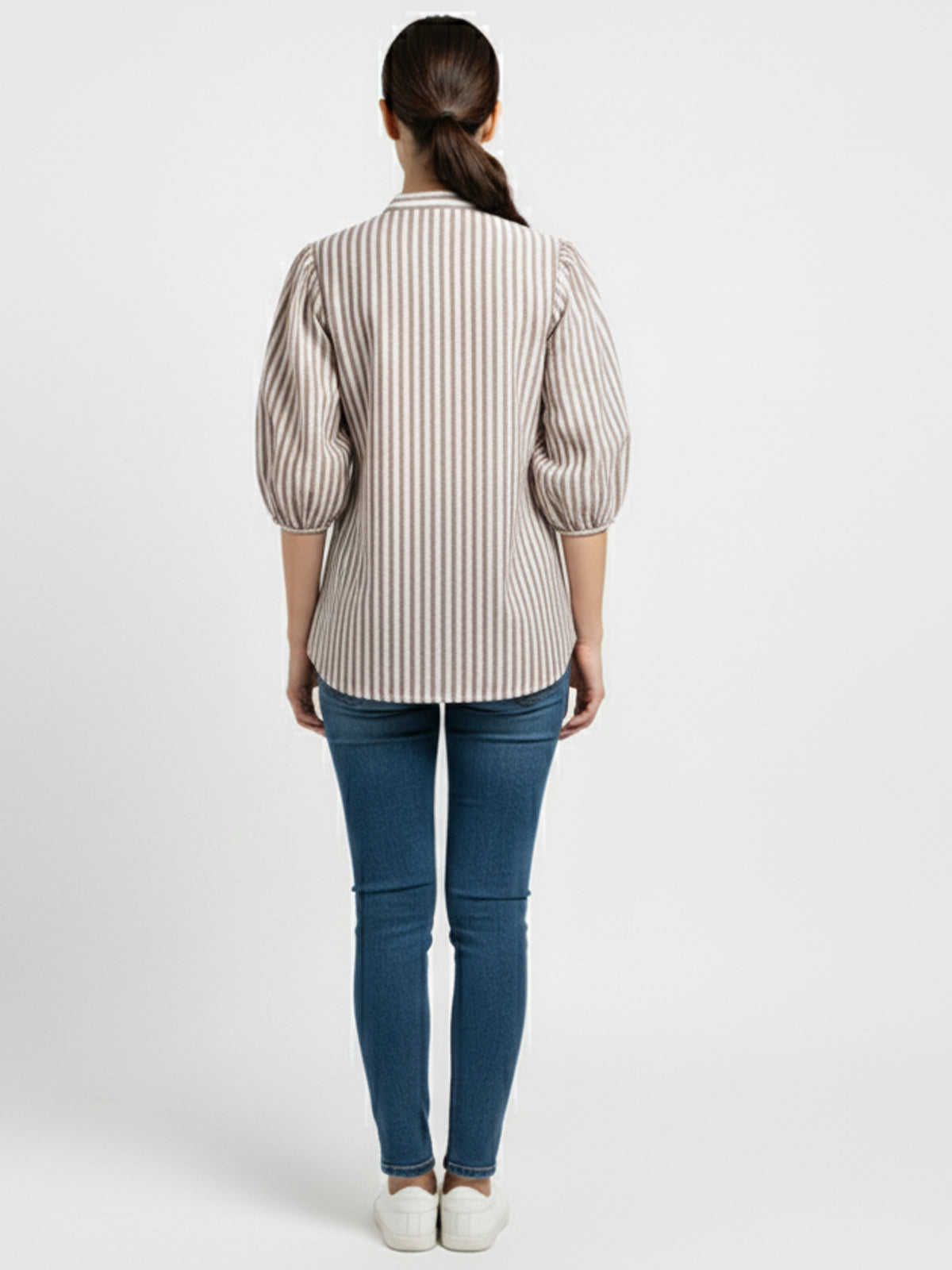 Elevate your everyday style with this elegant women’s vertical striped shirt, designed for both casual and semi-formal wear. Featuring a refined mandarin collar and a half button placket with classic buttons, this top offers a timeless and sophisticated appeal. The shoulder pleated design and stylish 3/4 puff sleeves add a modern, feminine touch while ensuring all-day comfort. Crafted from soft, breathable fabric, it is perfect for work, outings, and seasonal wear. The hip-length fit pairs effortlessly with jeans, trousers, or skirts, making it a versatile wardrobe essential for effortless chic styling.