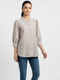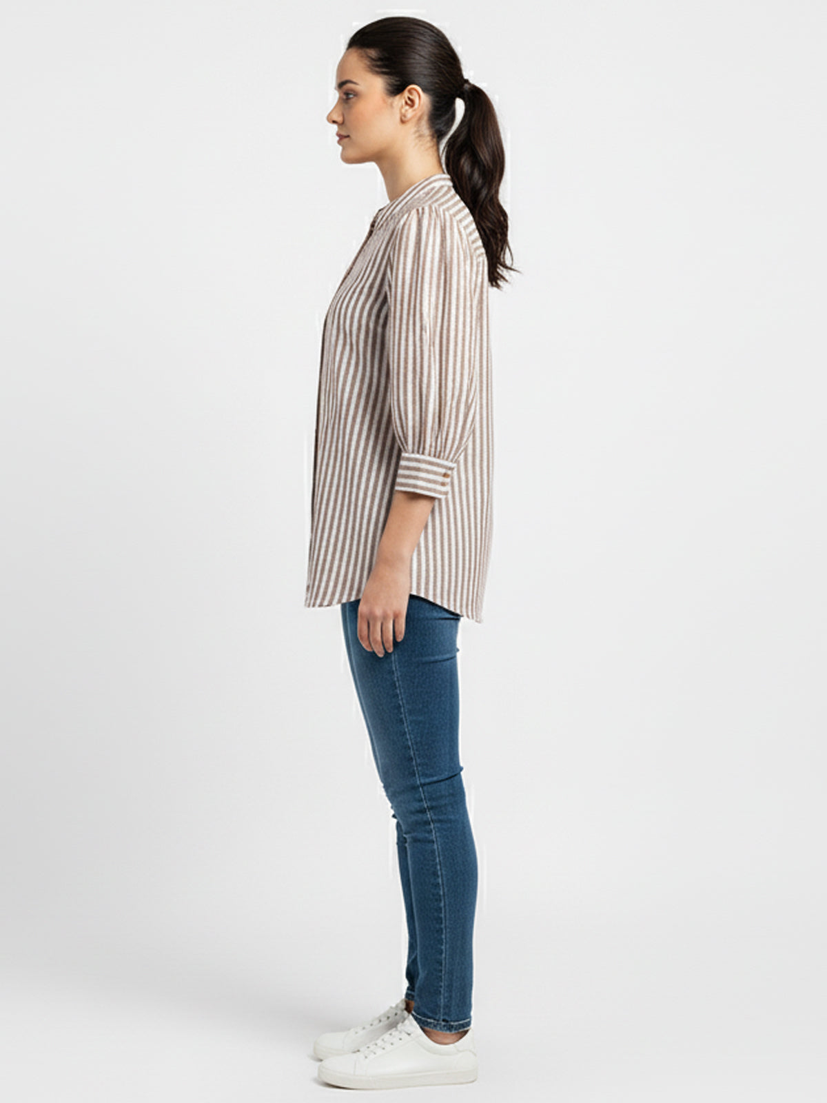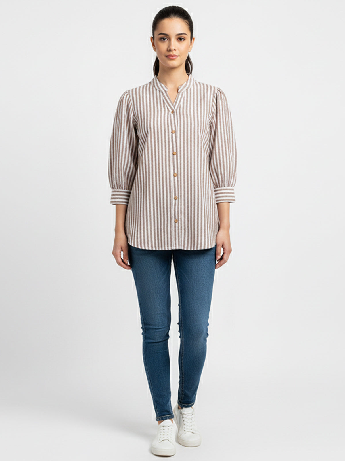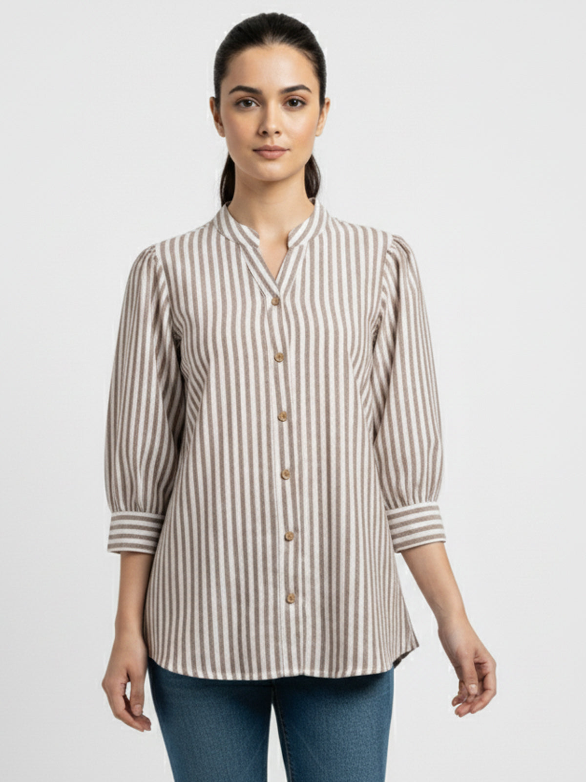 Elevate your everyday style with this elegant women’s vertical striped shirt, designed for both casual and semi-formal wear. Featuring a refined mandarin collar and a half button placket with classic buttons, this top offers a timeless and sophisticated appeal. The shoulder pleated design and stylish 3/4 puff sleeves add a modern, feminine touch while ensuring all-day comfort. Crafted from soft, breathable fabric, it is perfect for work, outings, and seasonal wear. The hip-length fit pairs effortlessly with jeans, trousers, or skirts, making it a versatile wardrobe essential for effortless chic styling.