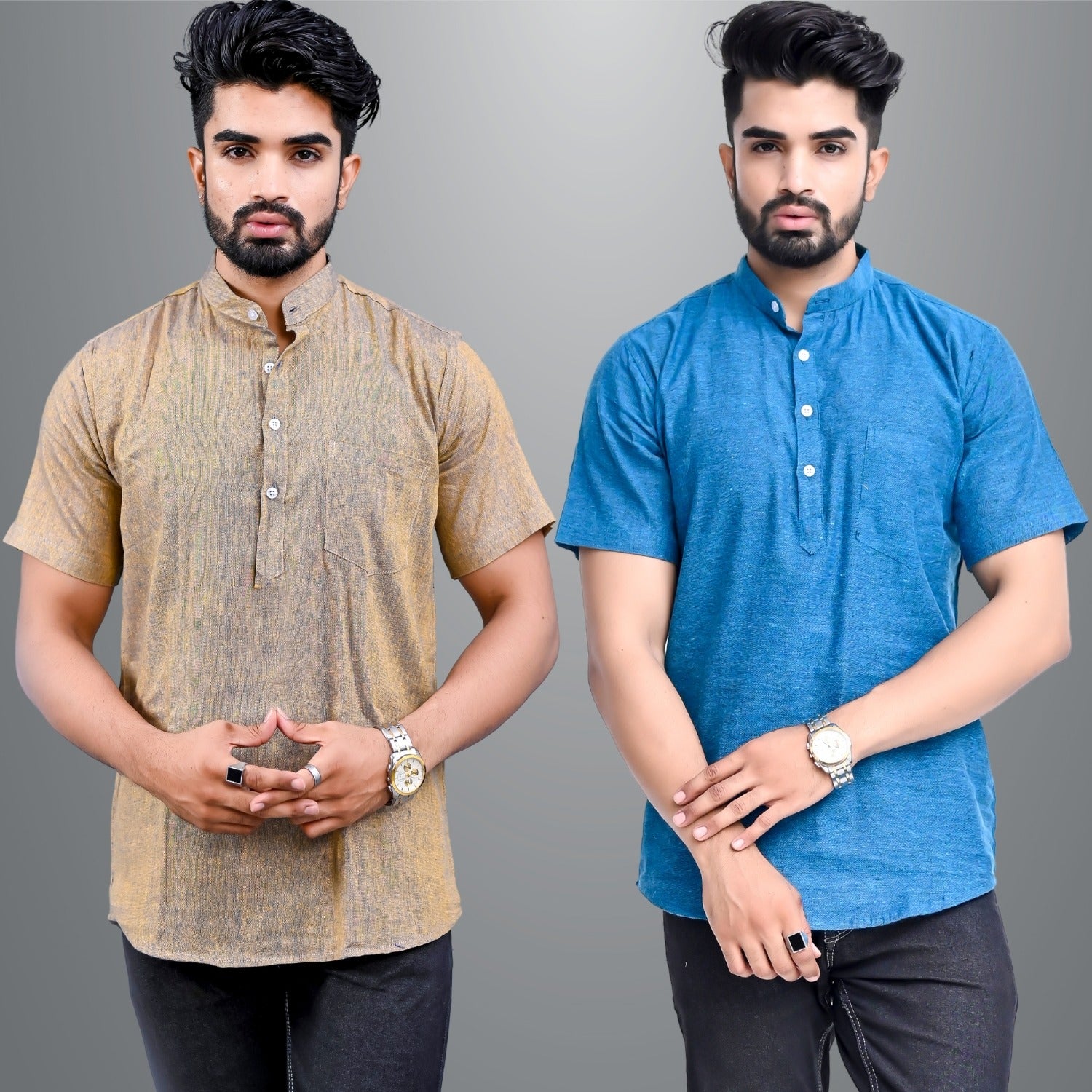 Mens Regular Fit Brown and Teal Blue Half Sleeve Cotton Short Kurta Combo