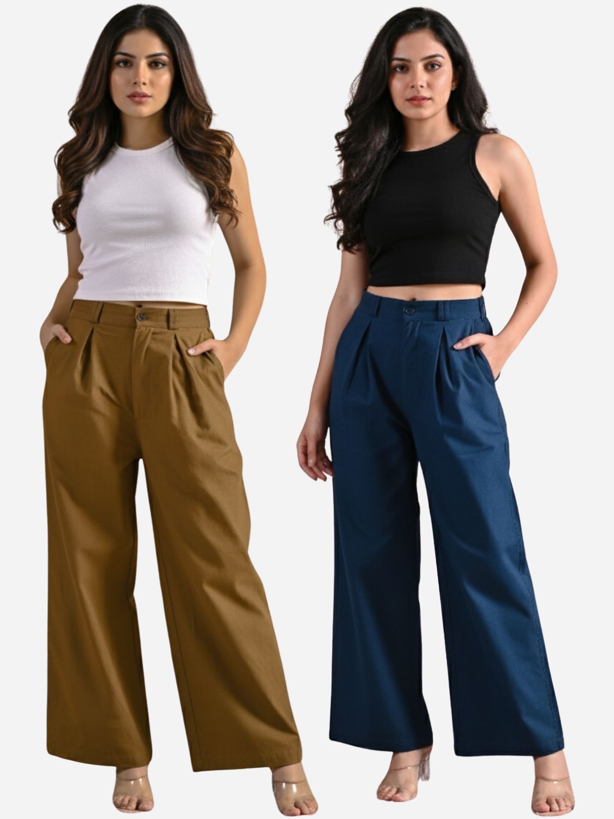 Pack Of 2 Brown And Teal Blue Women Cotton Wide Leg Pants