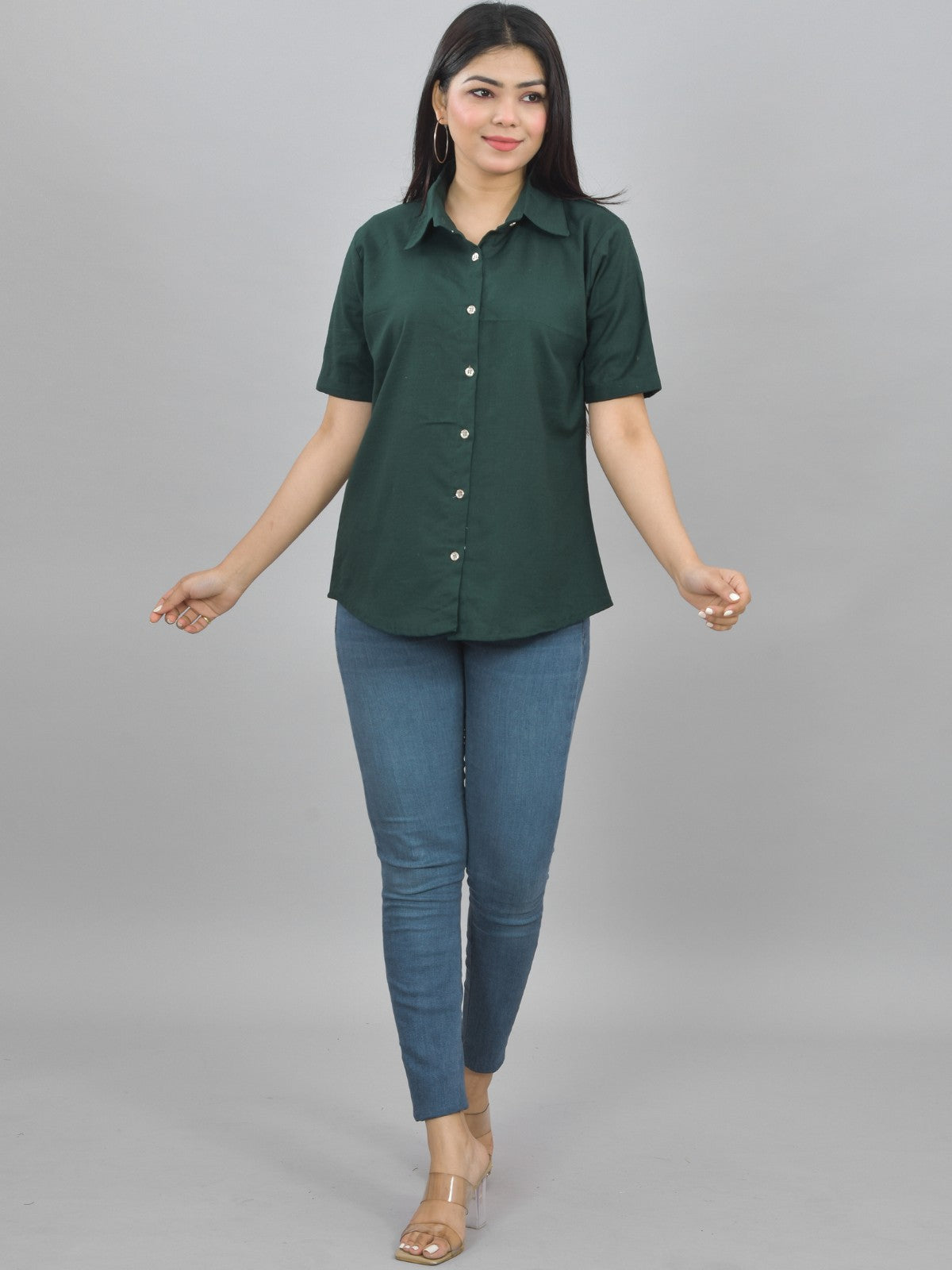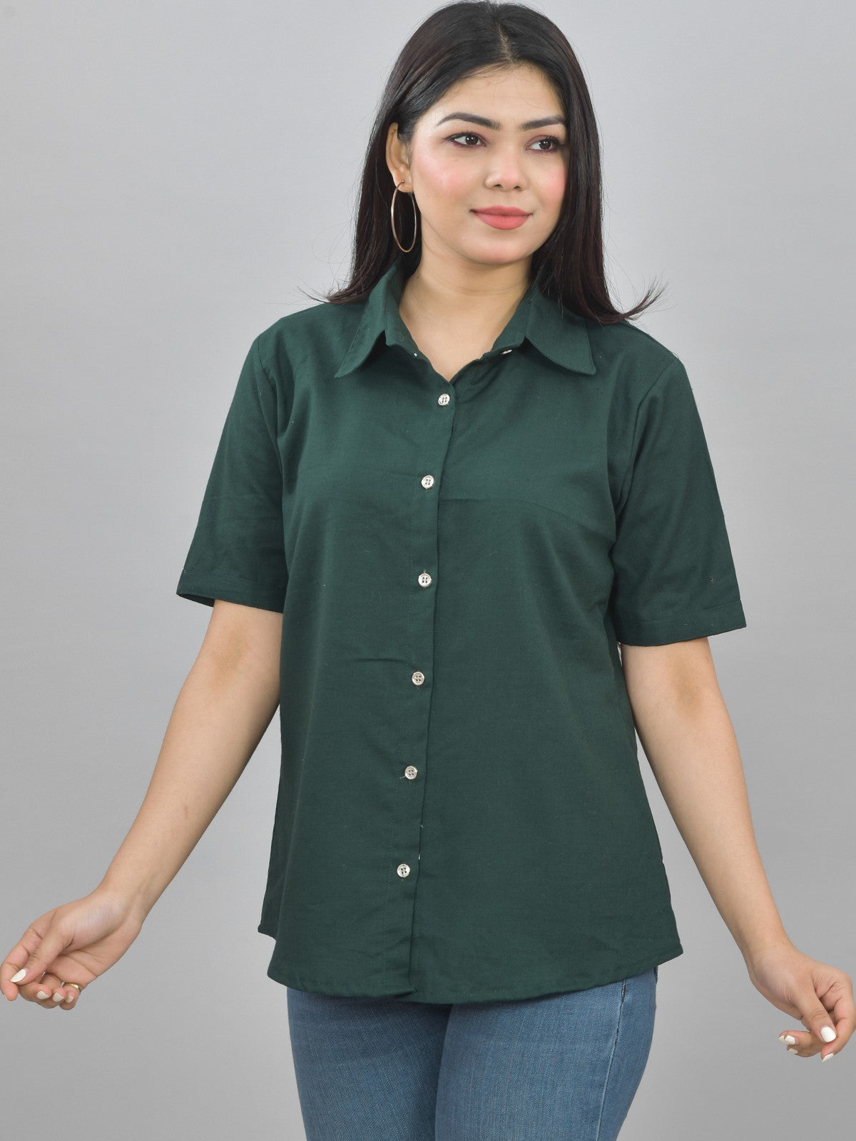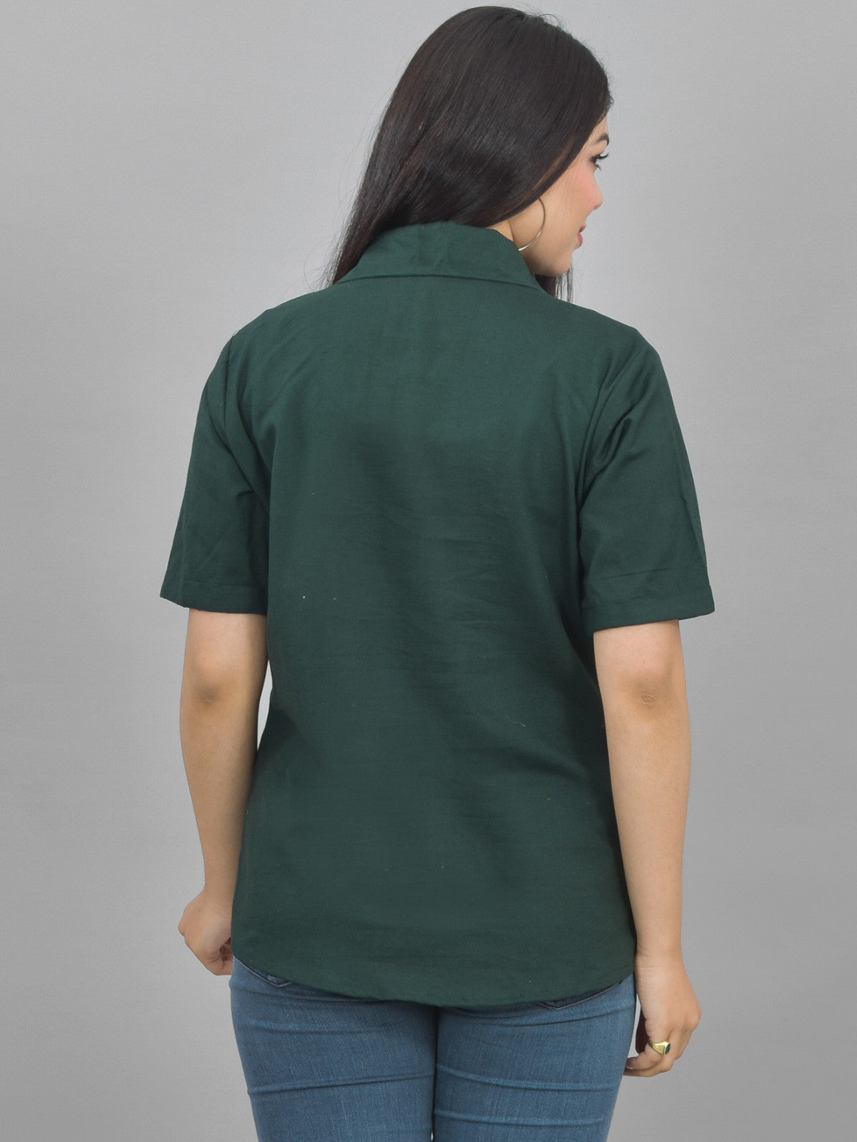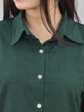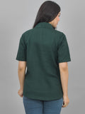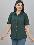Women Solid Bottle Green Half Sleeve Spread Collar Cotton Shirt