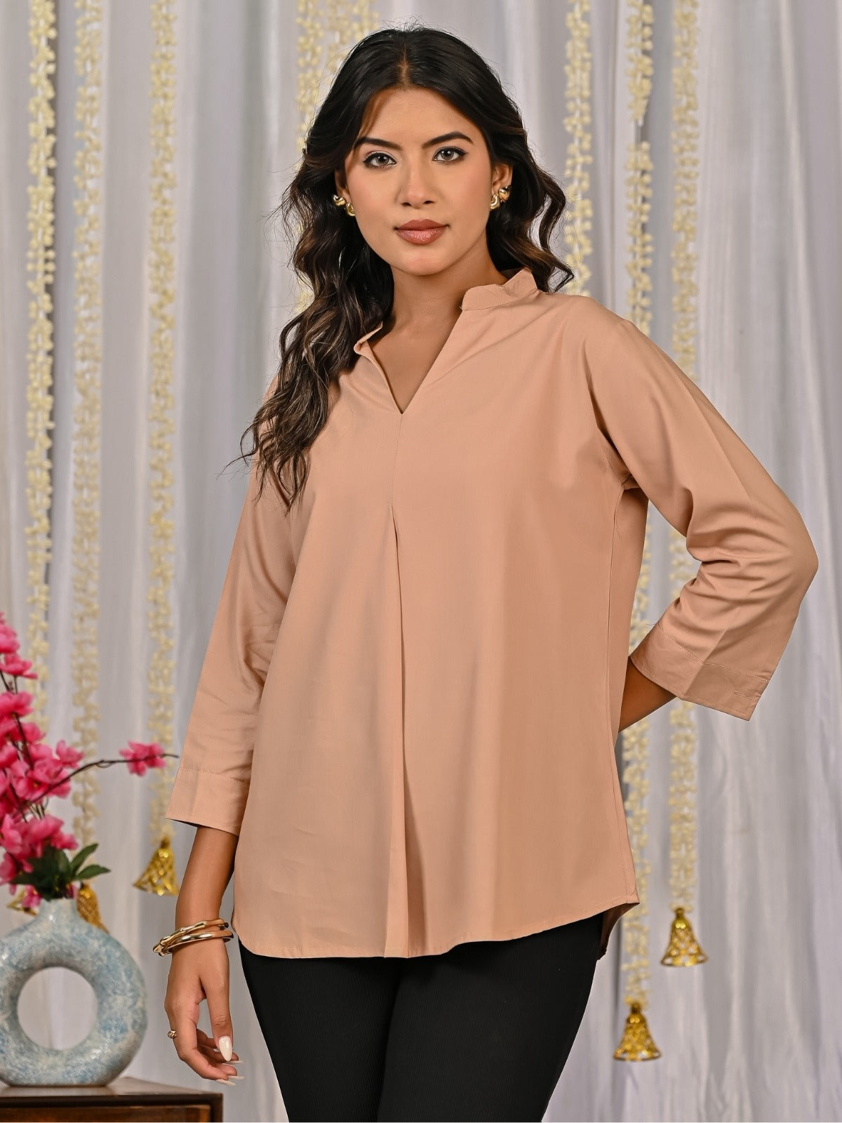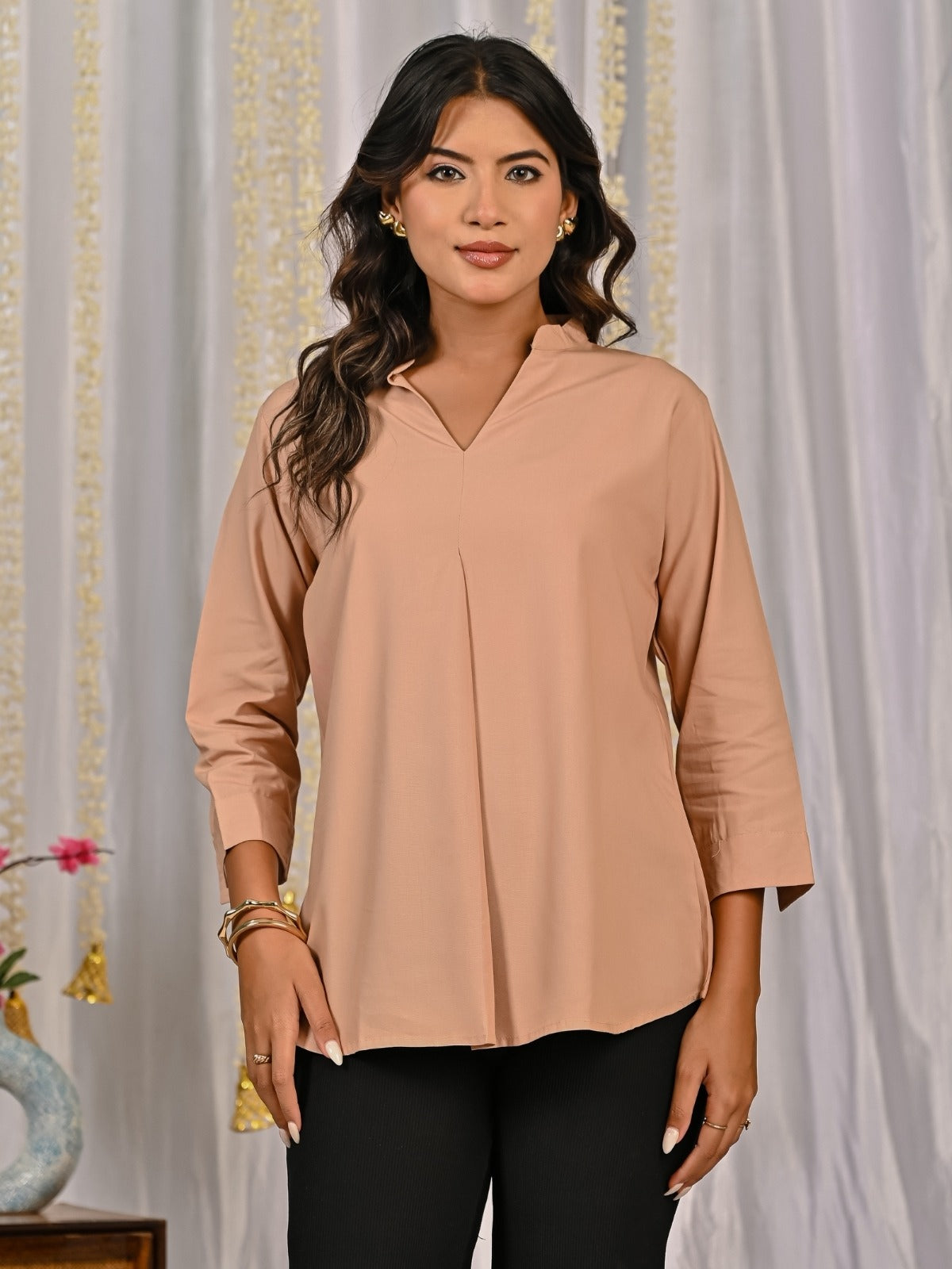 Discover our Solid Viscose V-Neck Collar Pleated Top for Women, designed to blend comfort with timeless style. Crafted from premium viscose fabric, this chic top features a flattering V-neck with a mandarin collar, elegant pleated detailing, and versatile 3/4th sleeves for a modern touch. Available in sizes S to 2XL and a wide range of 10 vibrant colors, it ensures the perfect fit for every woman. Ideal for both casual outings and office wear, this stylish top can be effortlessly paired with jeans, trousers, or skirts for a polished look. Soft, breathable, and easy to style, it’s a wardrobe .