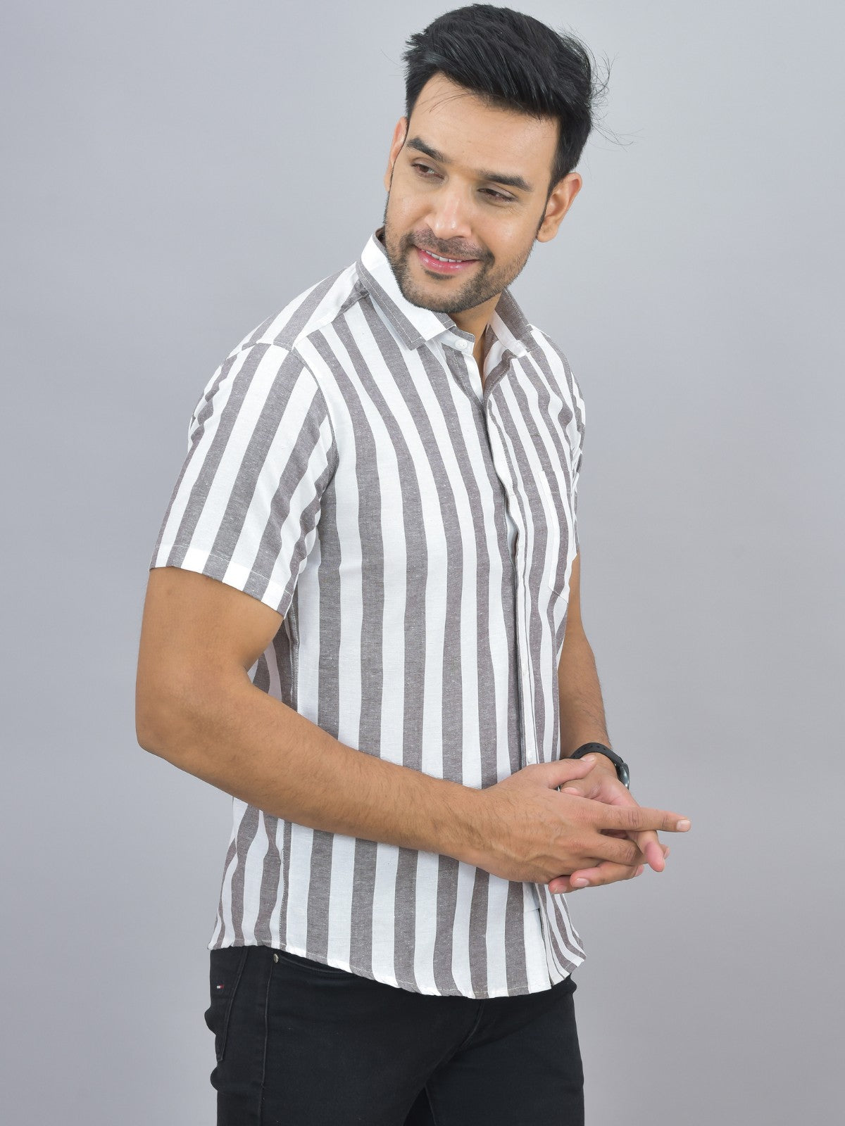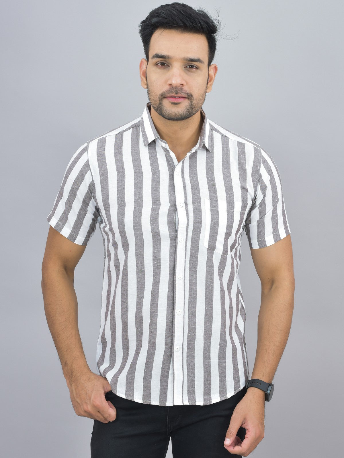 Mens Regular Fit Coffee Striped Half Sleeves Cotton Casual Shirt