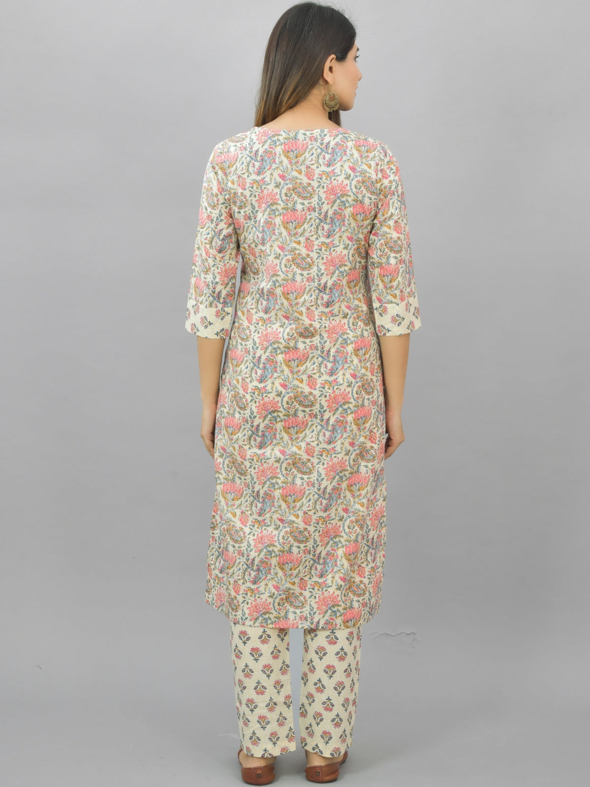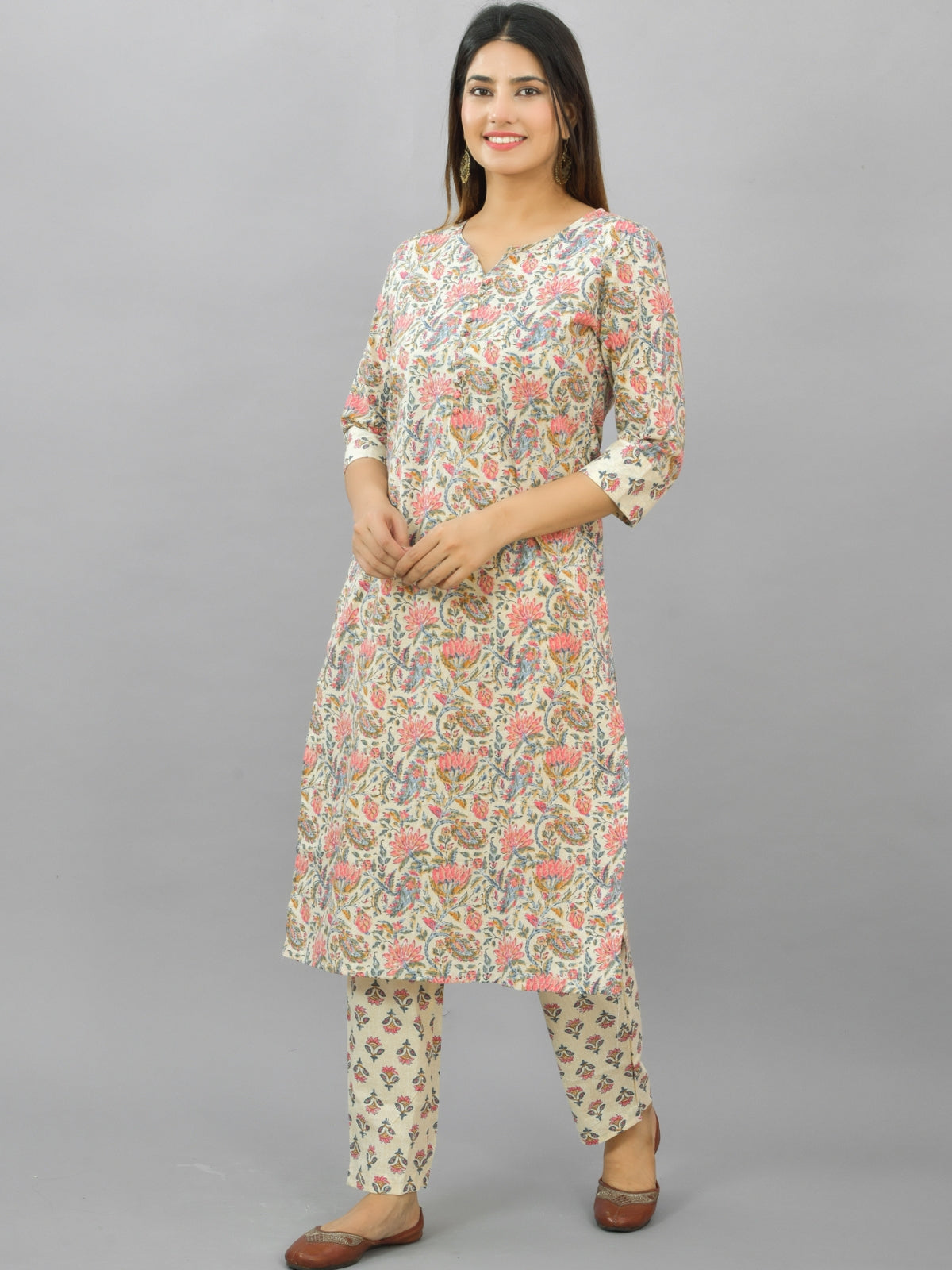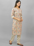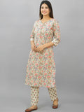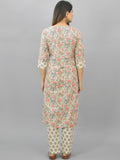 Womens Cream Flower Printed Kurti And Pant Set