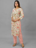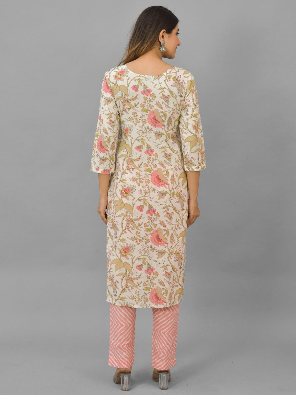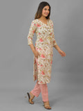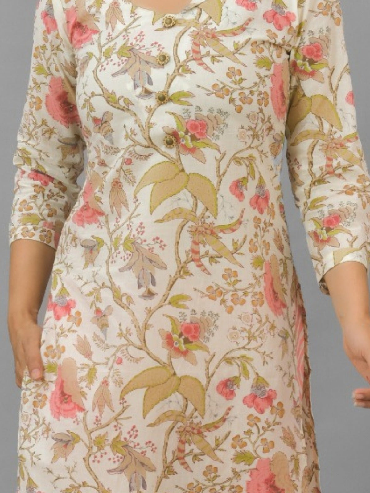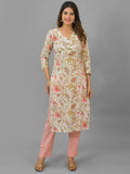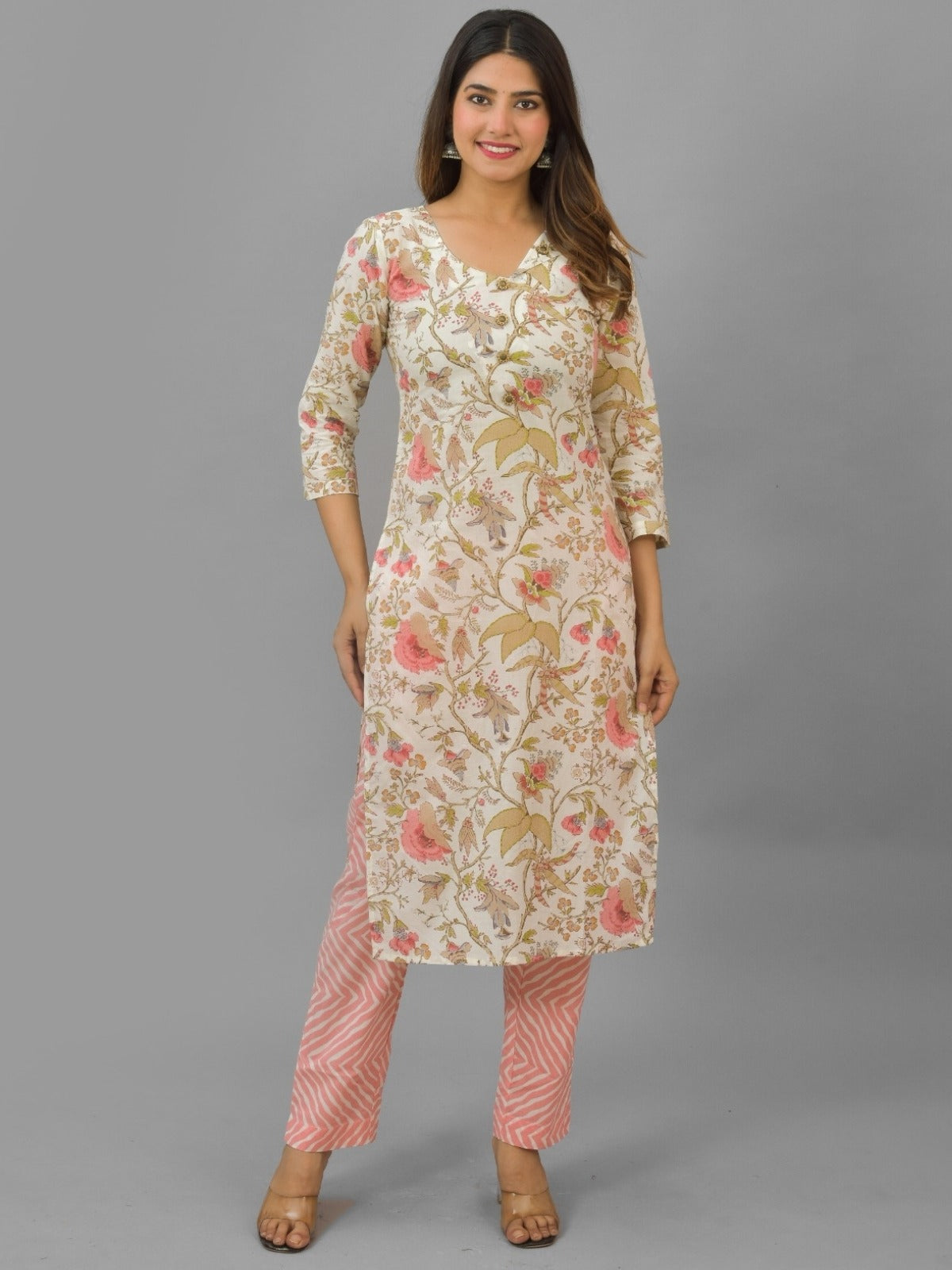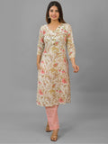 Womens Cream Flower Printed V Neck Kurta and Pant Set