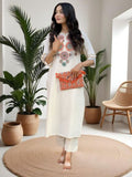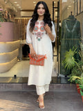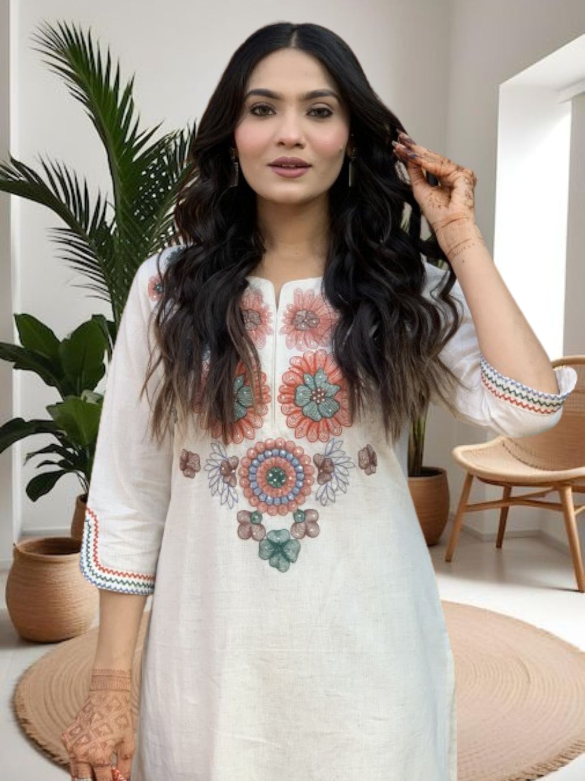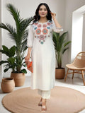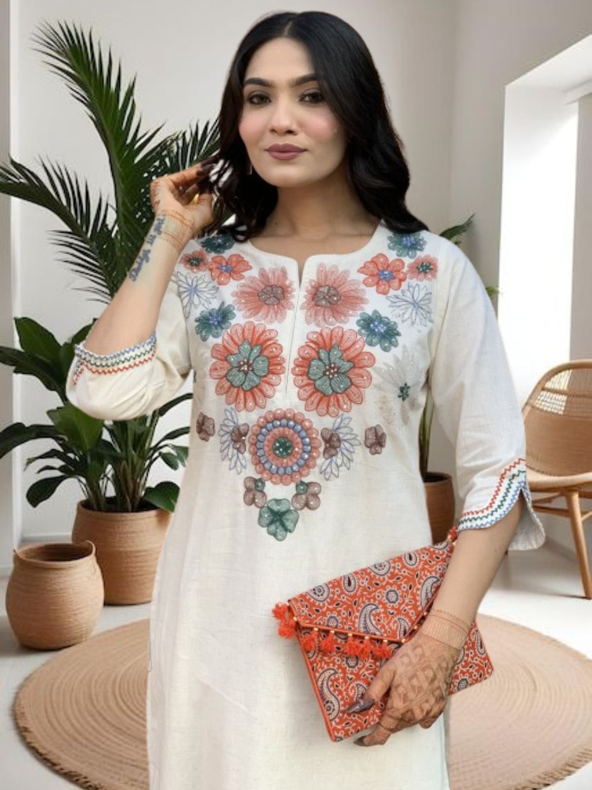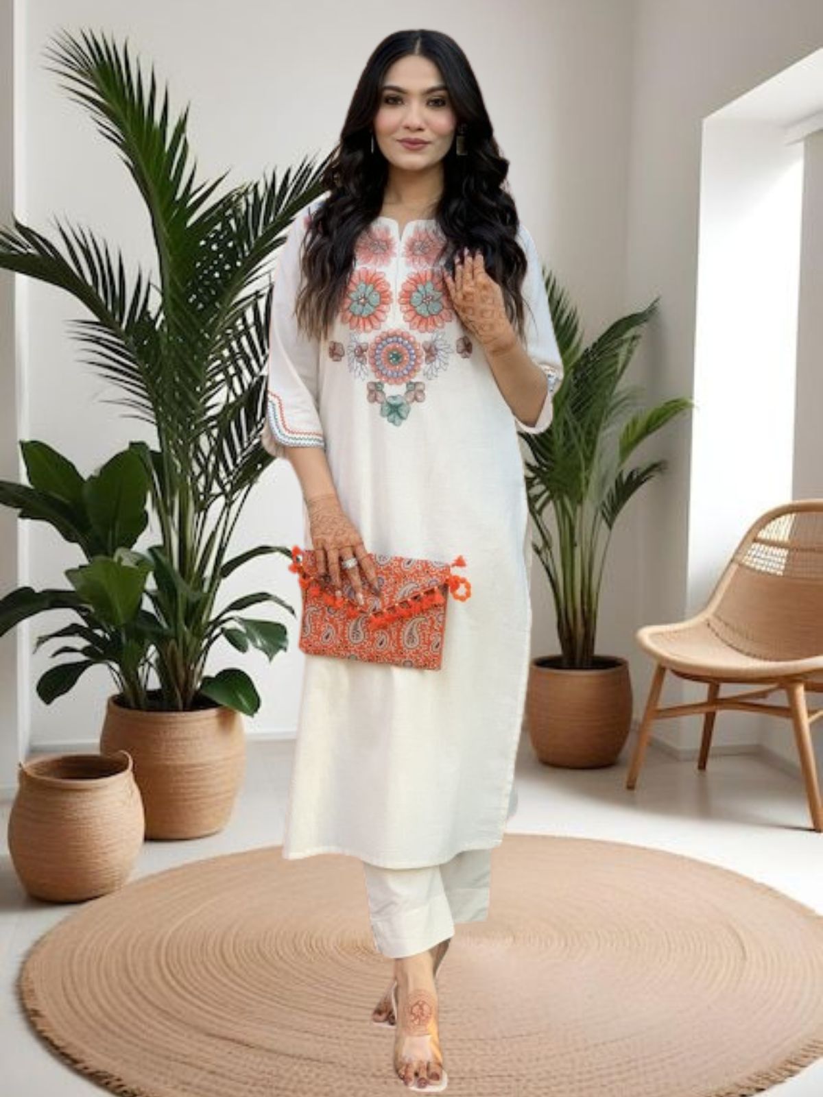 Designed for comfort and effortless style, this women's embroidery cotton kurta pant set will help you discover timeless elegance. The kurta has a lovely round neck that elegantly shapes into a subtle V-shape for a perfected appearance, and it has delicate embroidery work on soft, breathable cotton fabric. The top dress elevates your ethnic wardrobe with its full-length design and fashionable 3/4 sleeves. Made from the same high-quality cotton, the matching pants have a full-length silhouette and a fully elasticated waistband for a snug and comfortable fit throughout the day. This kurta set blends traditional charm with contemporary comfort, making it ideal for everyday wear or festive occasions. It is a must-have for any woman's wardrobe.