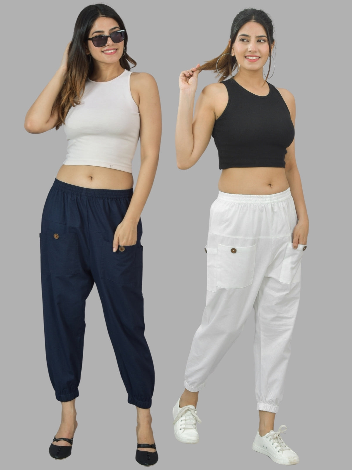 Combo Pack Of Womens Dark Blue And White Four Pocket Cotton Cargo Pants
