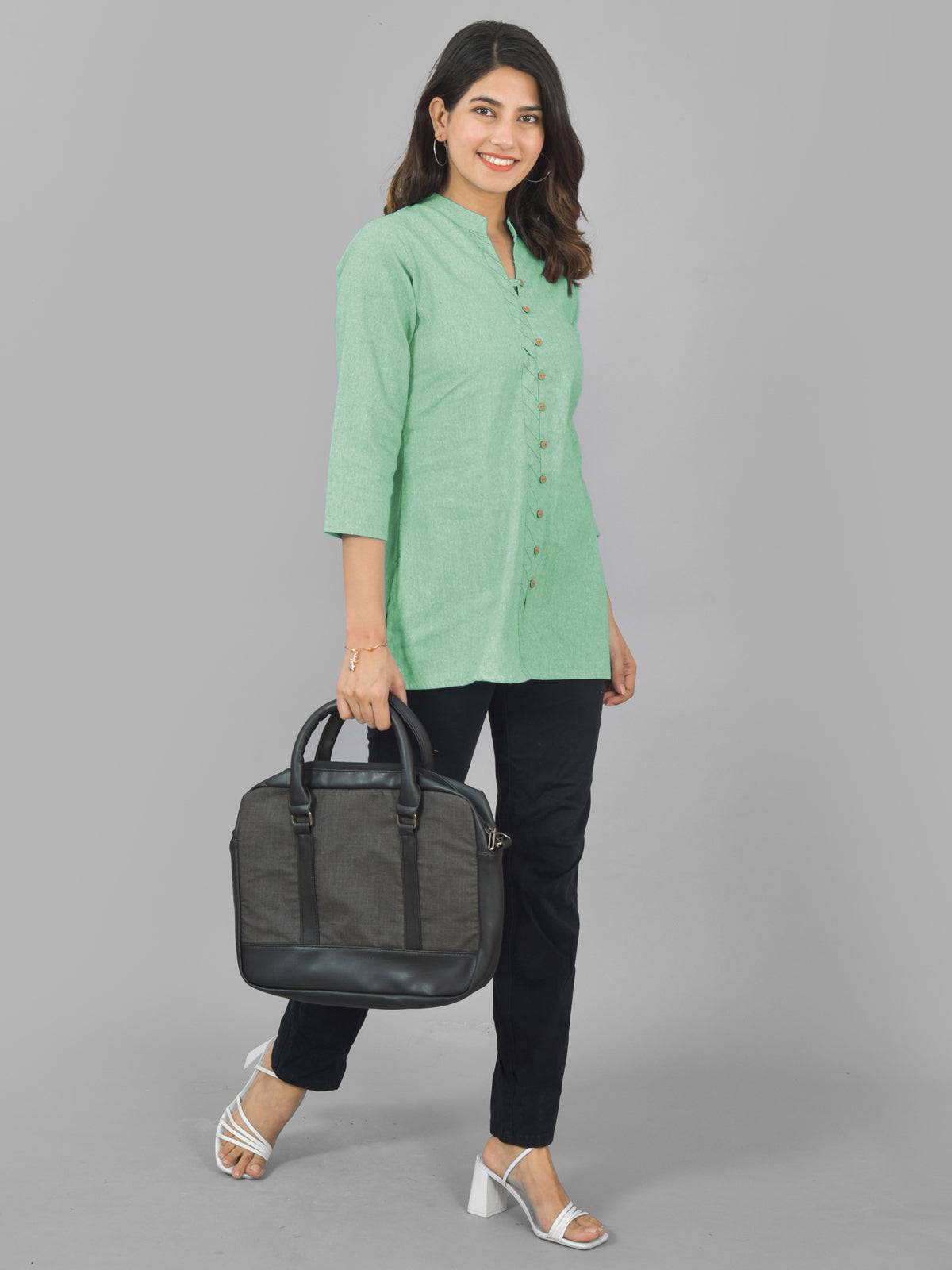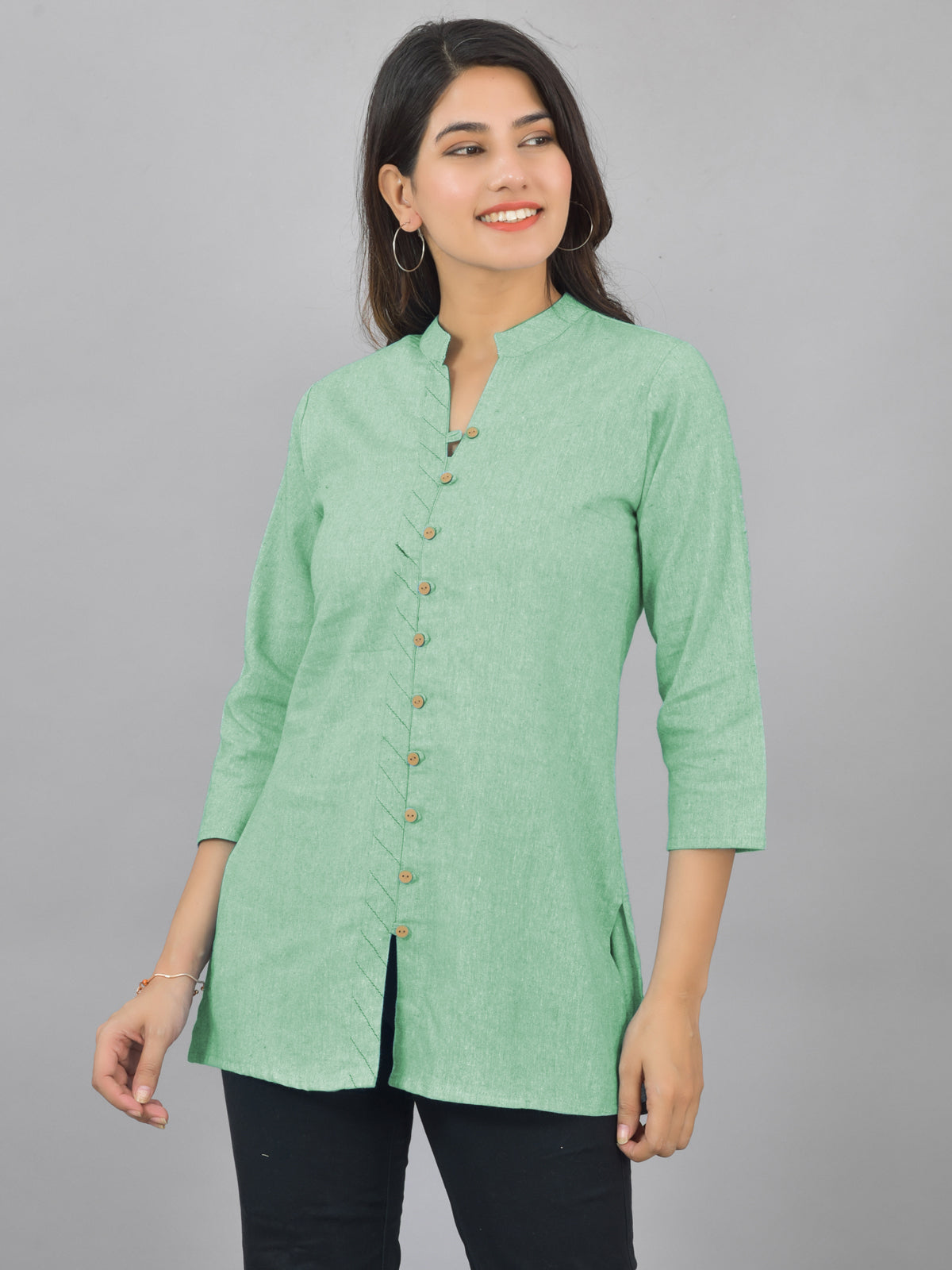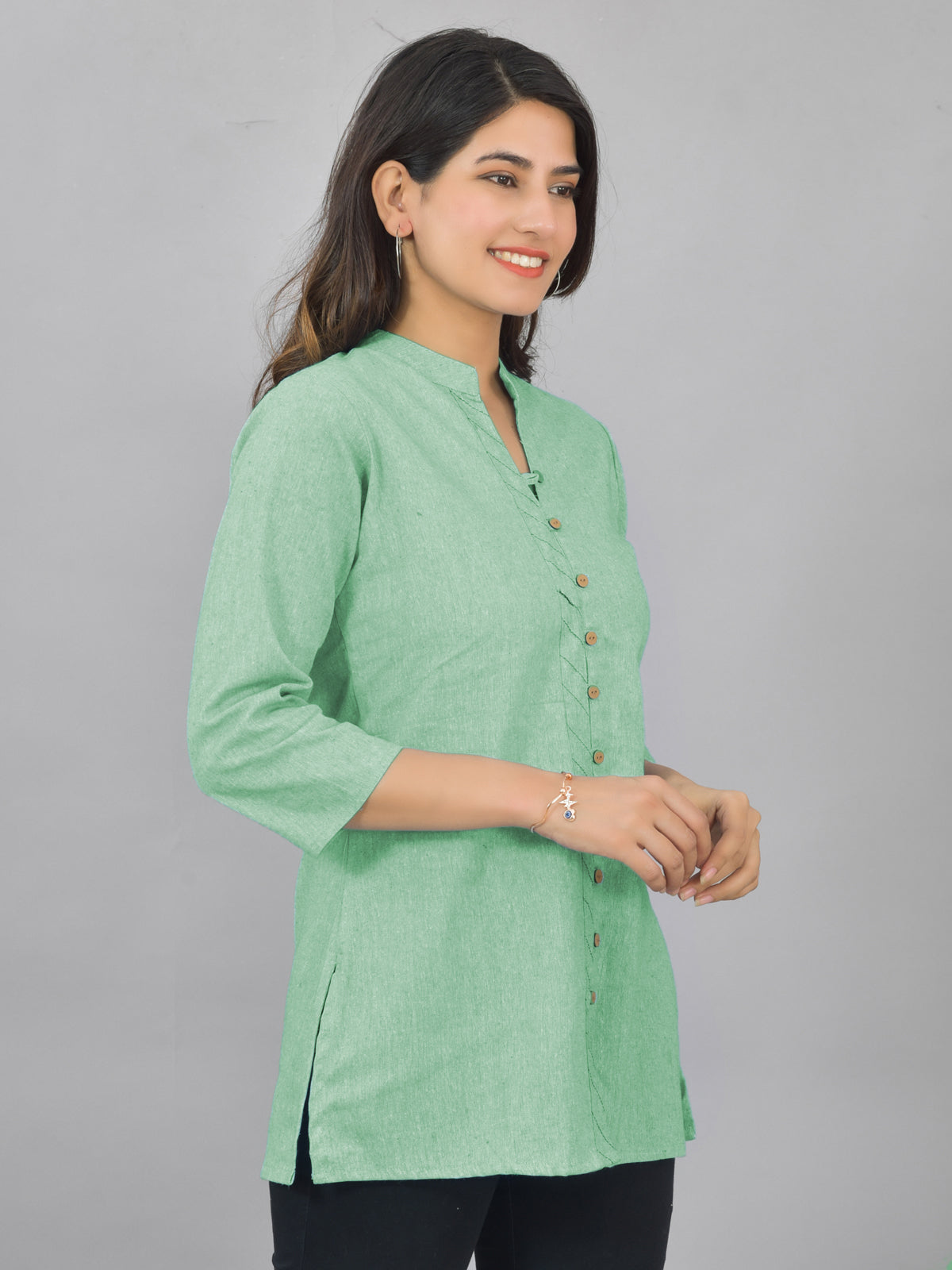Womens Green Woven Design Handloom Cotton Frontslit Short Kurti