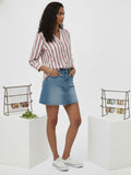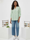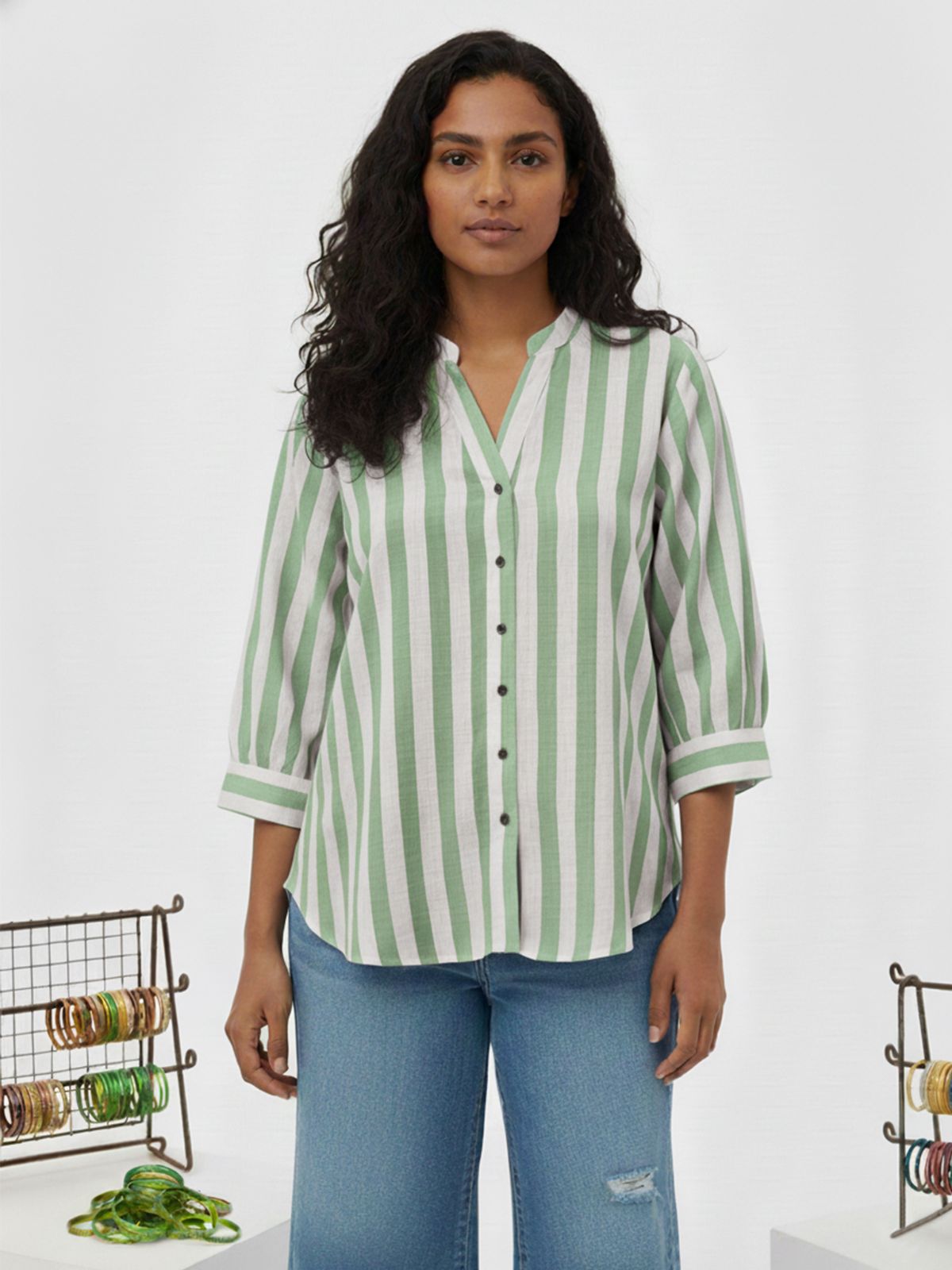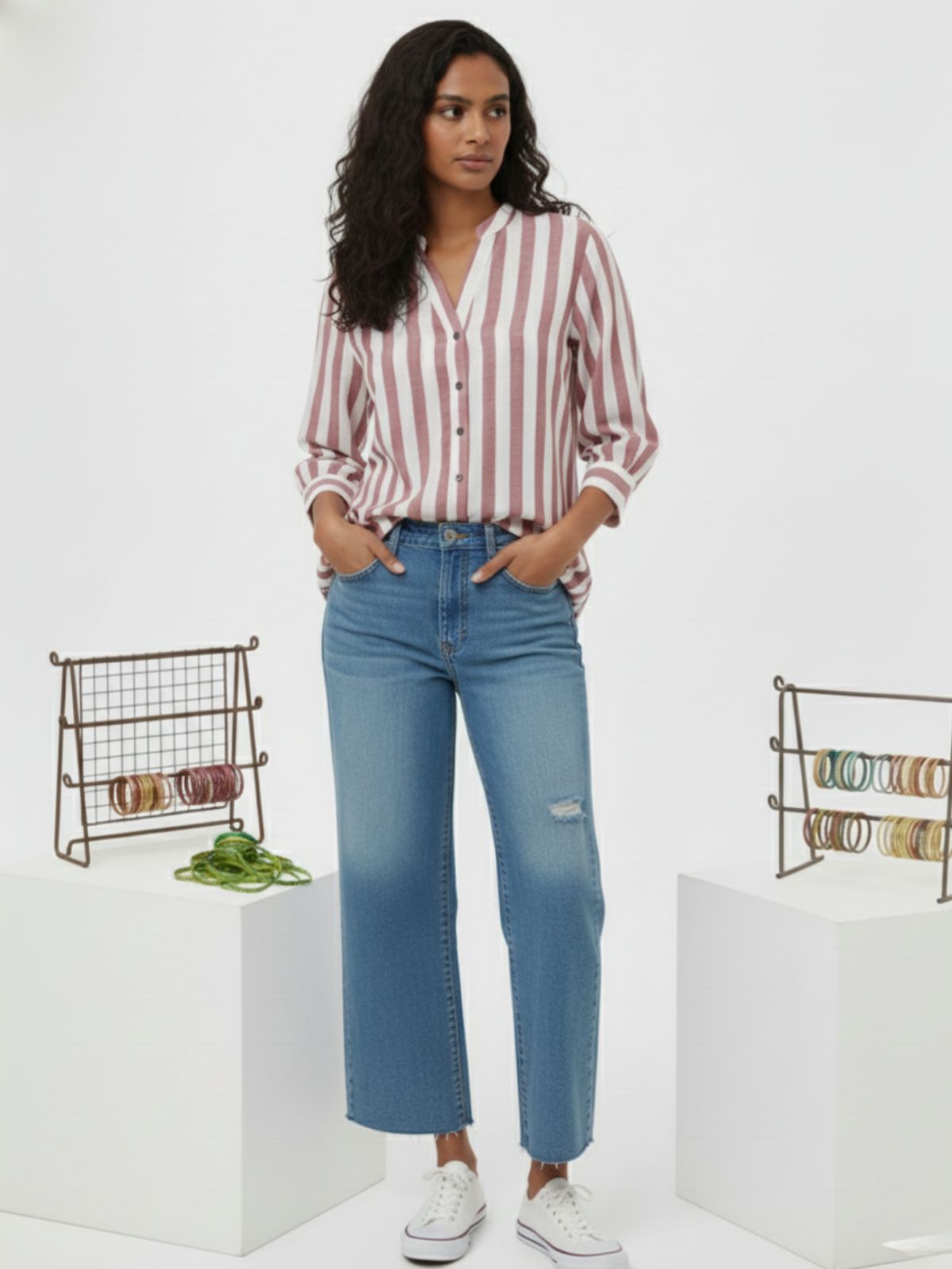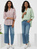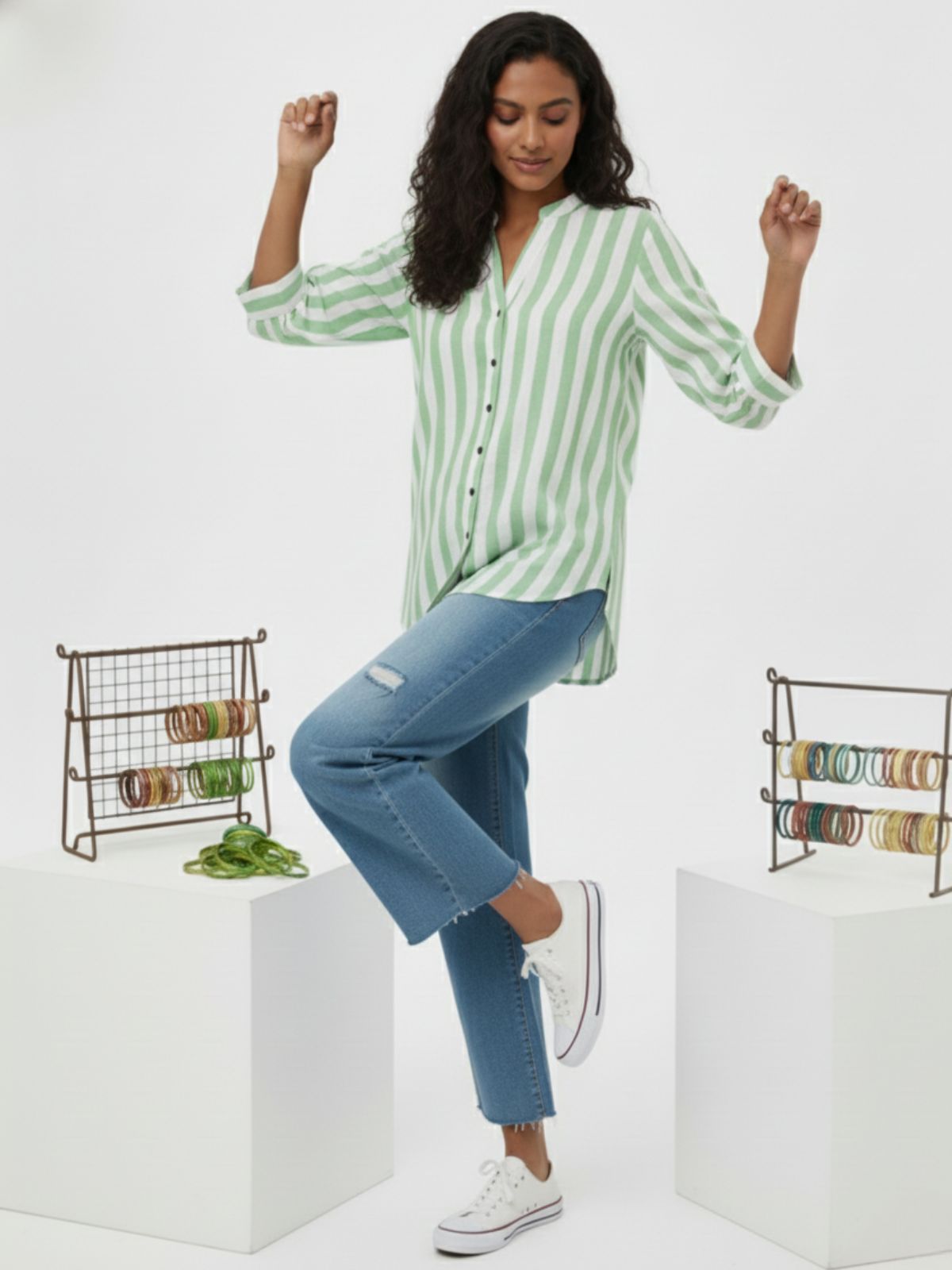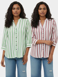 Discover effortless elegance with our Women’s Stripe Shirt featuring stylish shoulder pleats, 3/4th sleeves, and a classic button closure. Designed for both comfort and sophistication, this hip-length shirt offers a flattering fit for any occasion. Crafted from soft, breathable fabric, it blends timeless stripes with modern detailing, making it perfect for office wear or casual outings. Pair it with trousers or jeans for a chic, polished look that enhances your everyday style effortlessly.