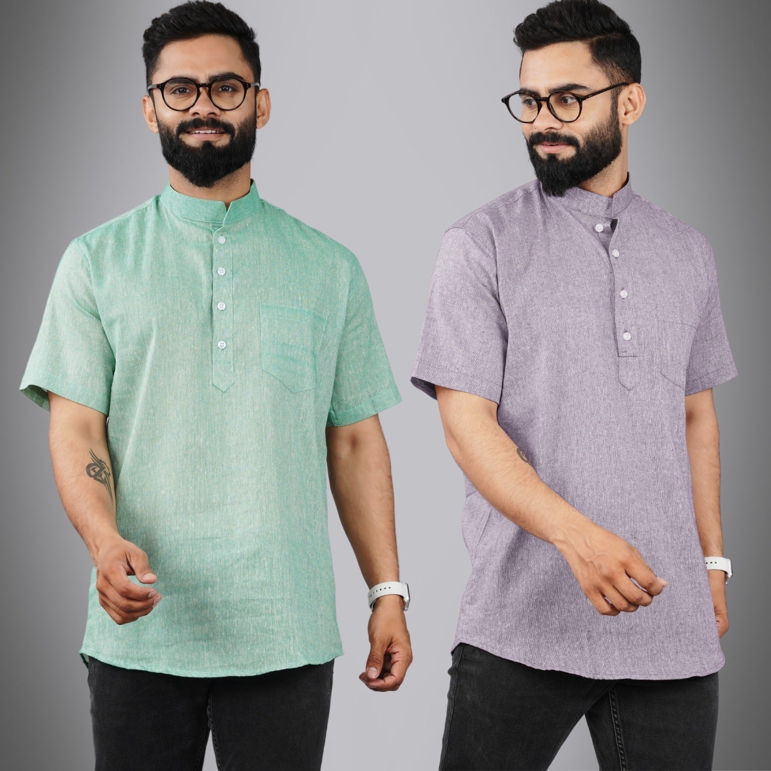 Pack Of 2 Mens Regular Fit Green And Purple Half Sleeve Cotton Short Kurta Combo