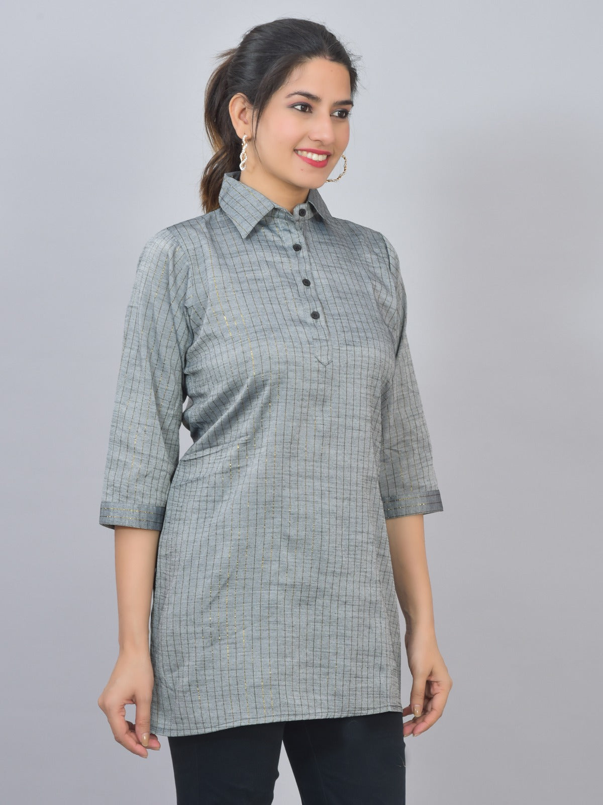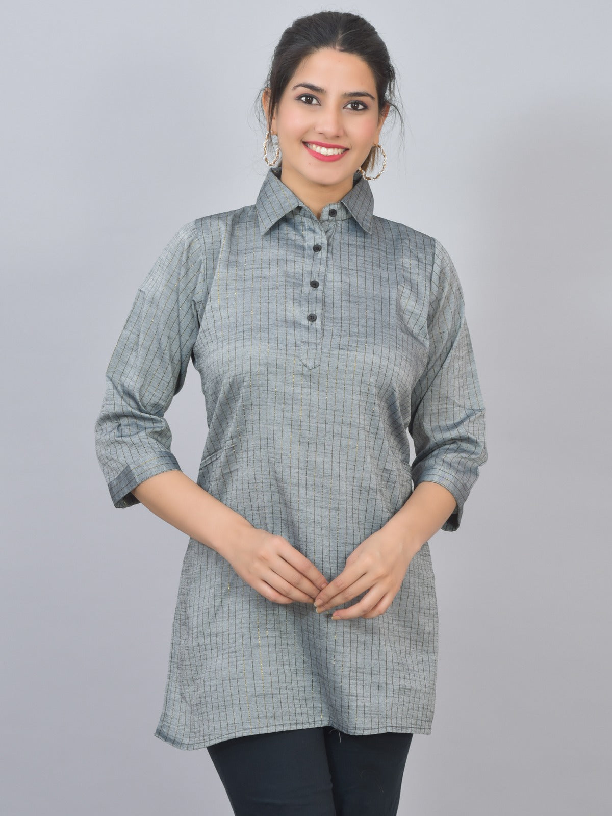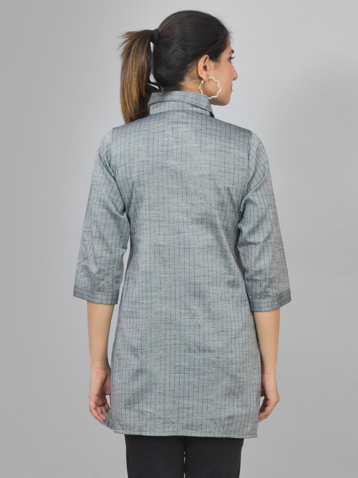 Womens Grey Lurex Striped Spread Collar Short Kurti