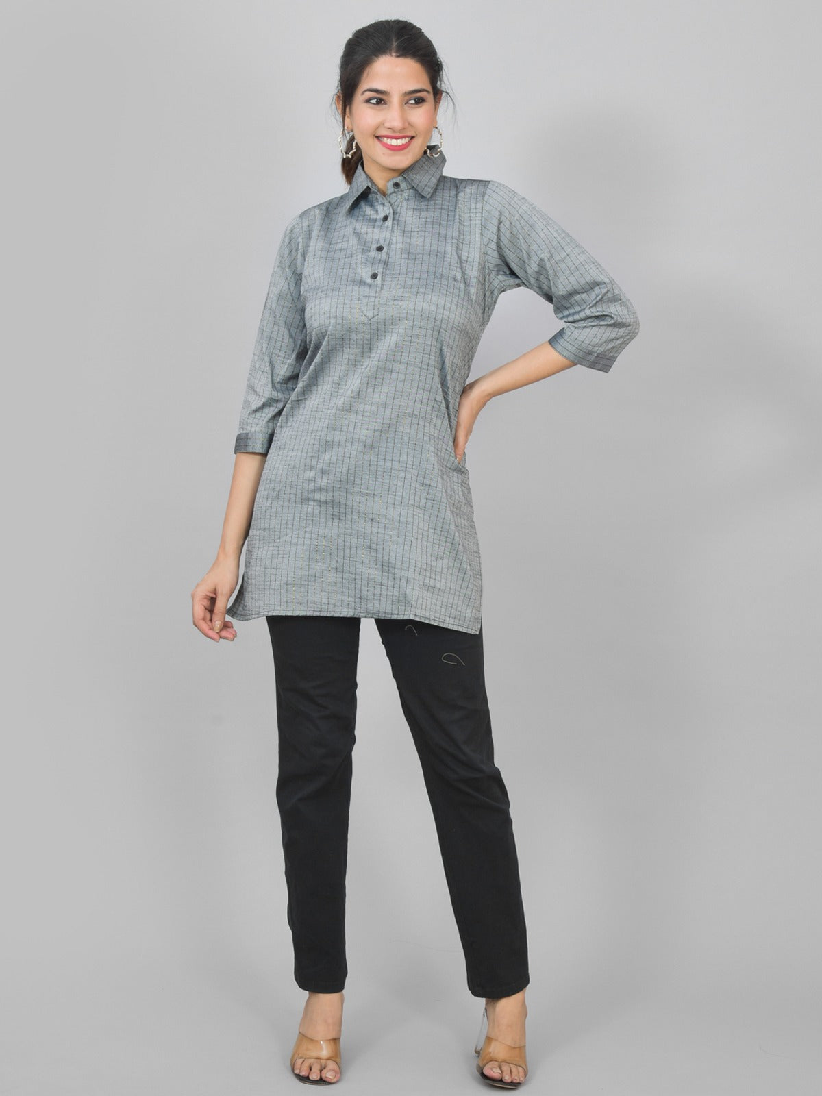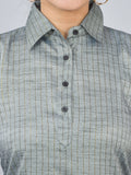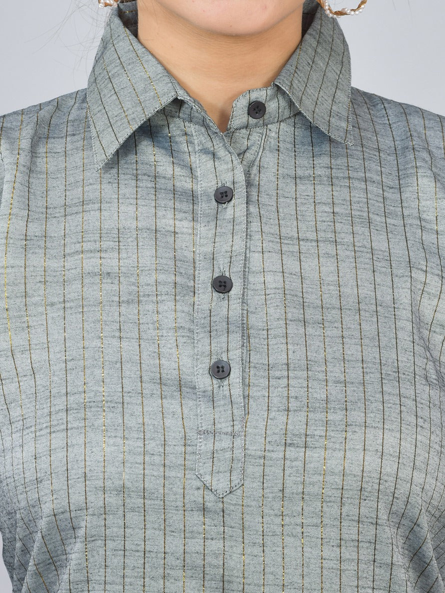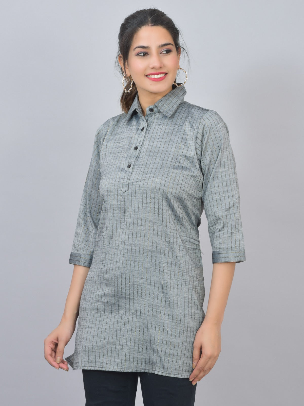 Womens Grey Lurex Striped Spread Collar Short Kurti