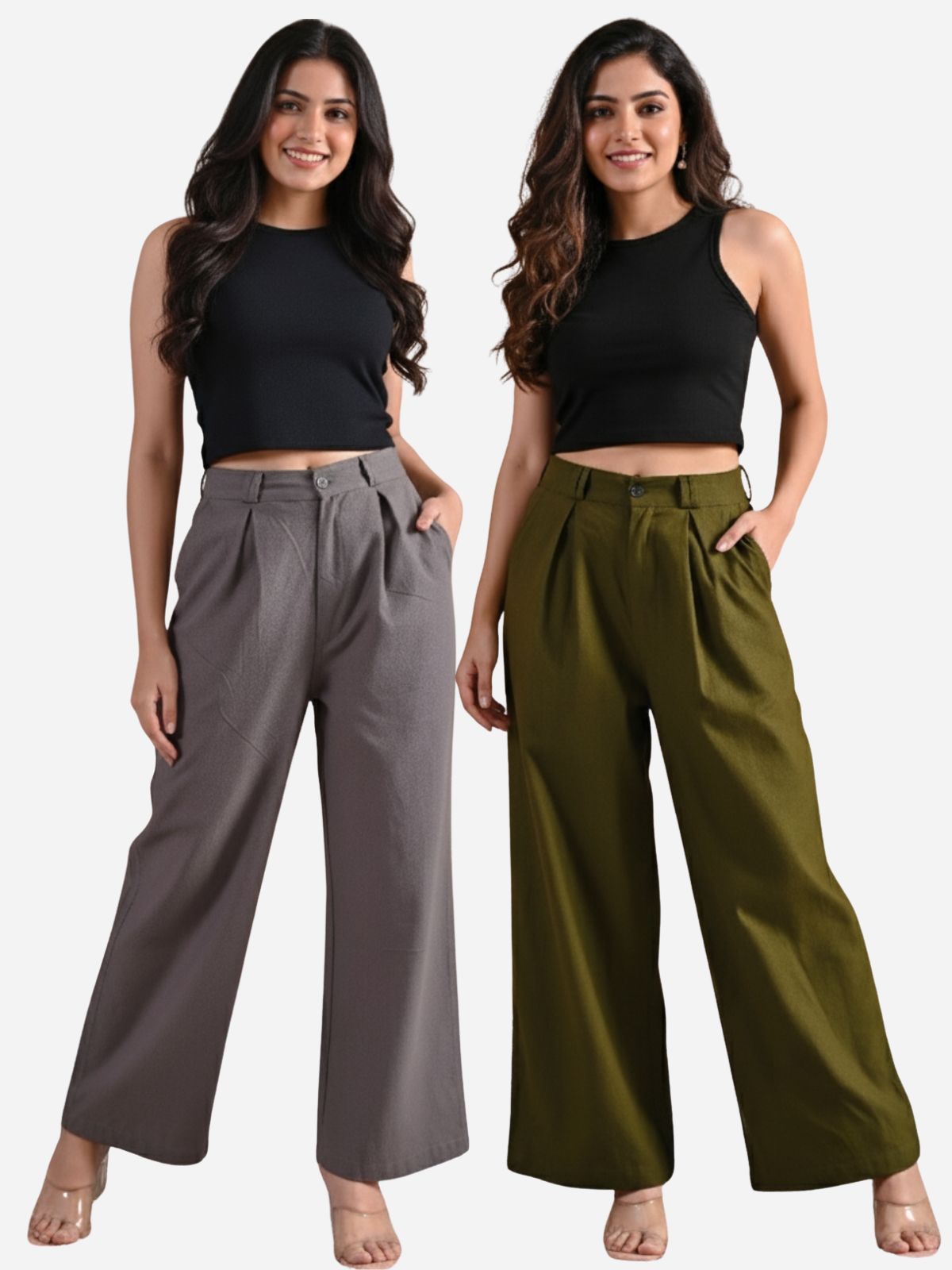 Pack Of 2 Grey And Mehendi Green Women Cotton Wide Leg Pants