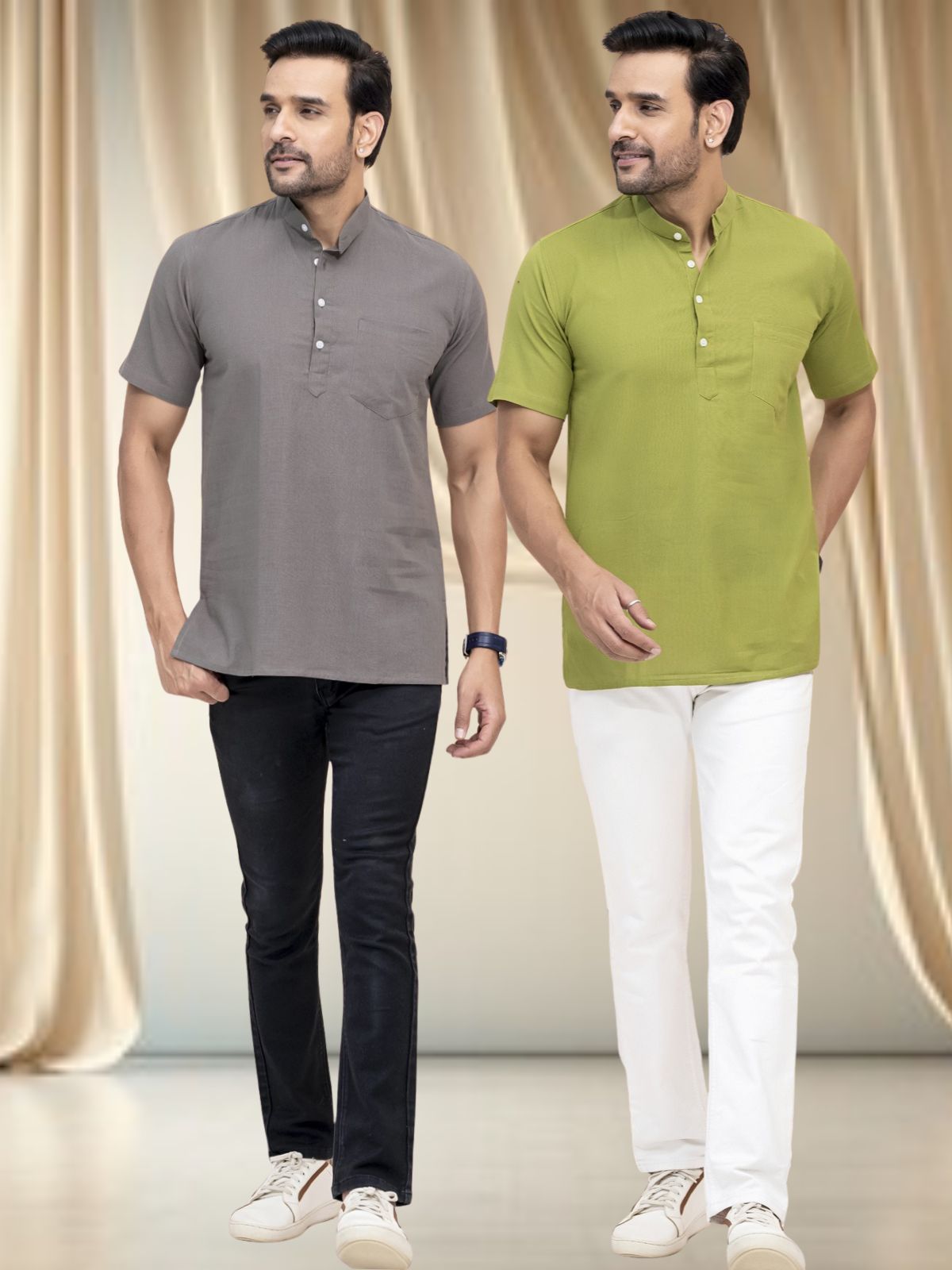 Pack Of 2 Mens Grey And Olive Green Cotton Short Kurta Combo