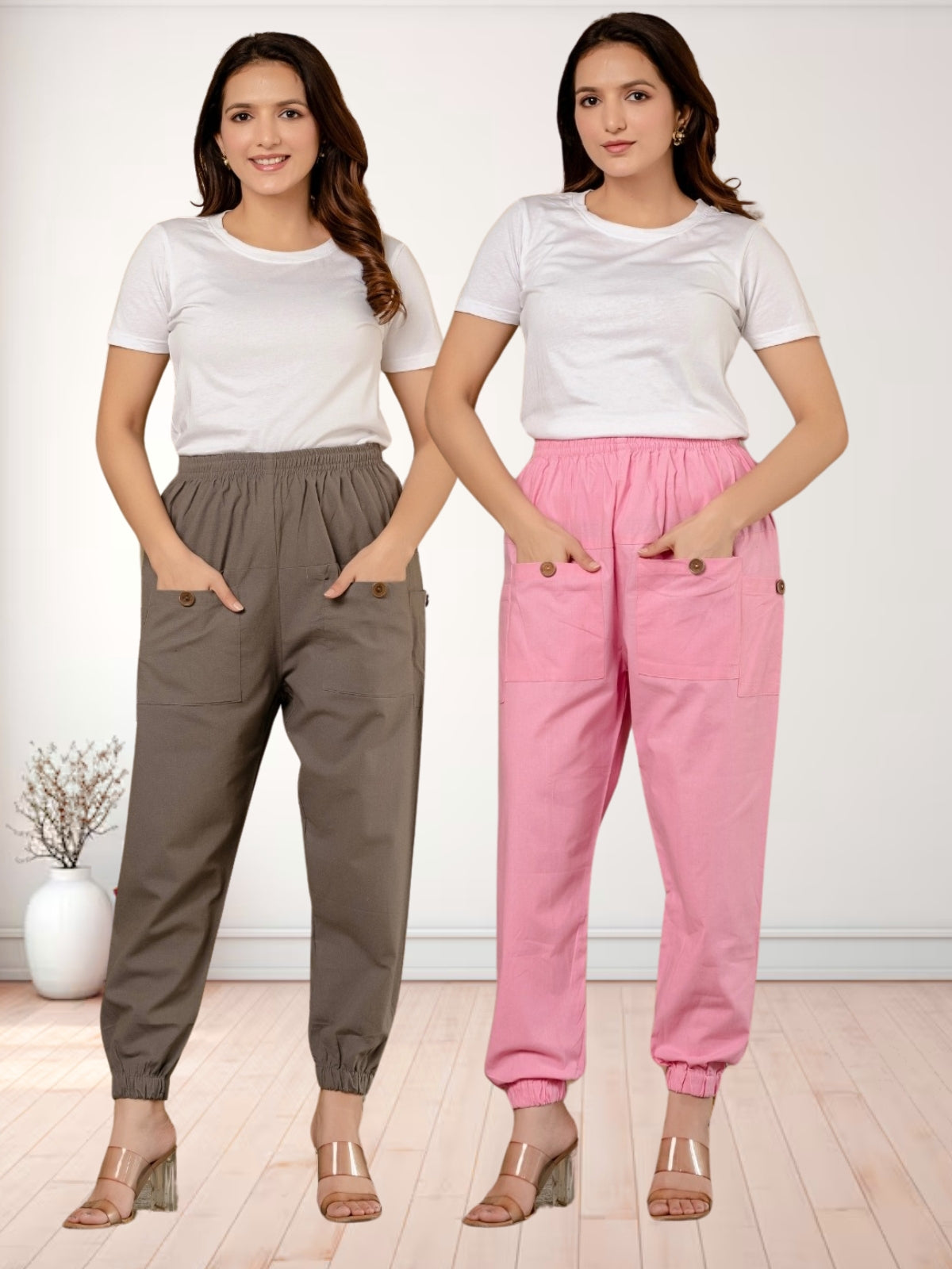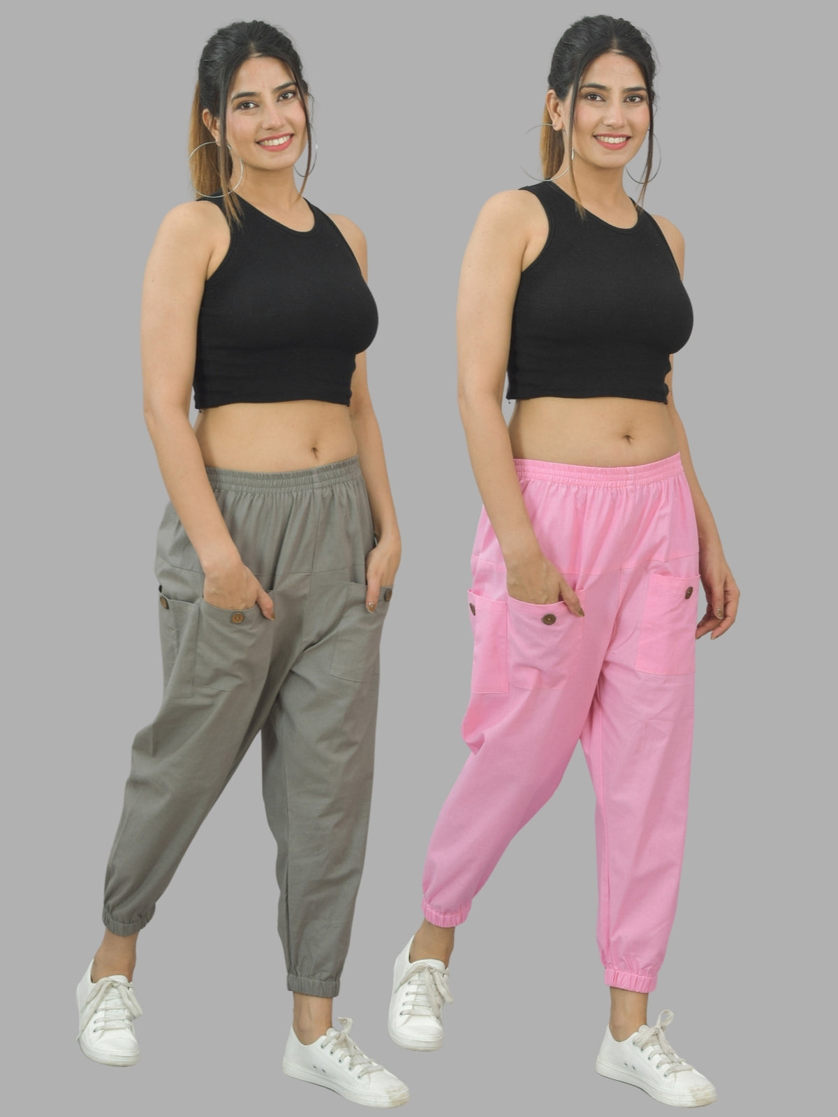Combo Pack Of Womens Grey And Pink Four Pocket Cotton Cargo Pants