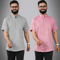 Pack Of 2 Mens Regular Fit Grey And Pink Half Sleeve Cotton Short Kurta Combo
