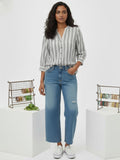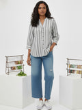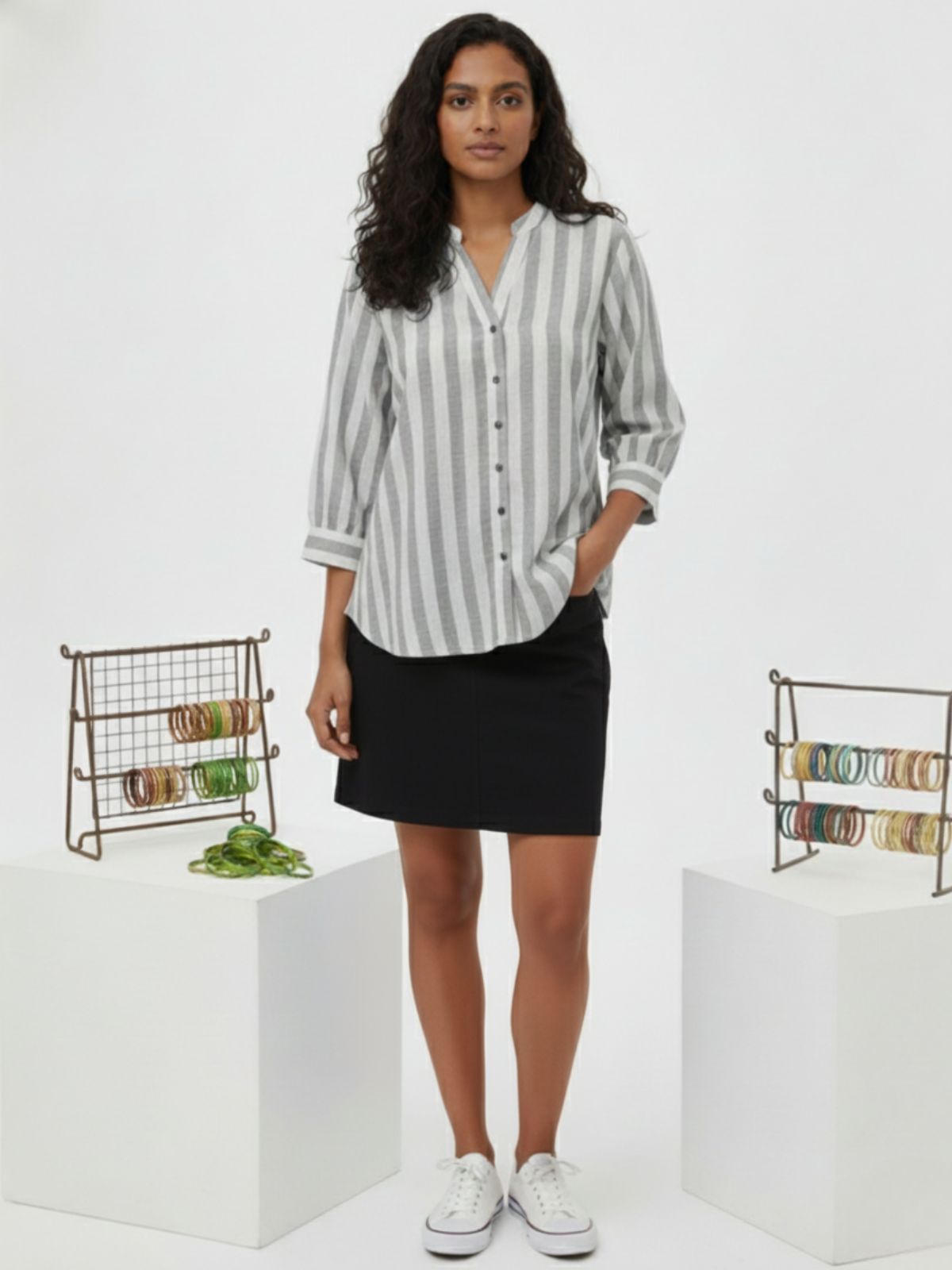 Discover effortless elegance with our Women’s Stripe Shirt featuring stylish shoulder pleats, 3/4th sleeves, and a classic button closure. Designed for both comfort and sophistication, this hip-length shirt offers a flattering fit for any occasion. Crafted from soft, breathable fabric, it blends timeless stripes with modern detailing, making it perfect for office wear or casual outings. Pair it with trousers or jeans for a chic, polished look that enhances your everyday style effortlessly.
