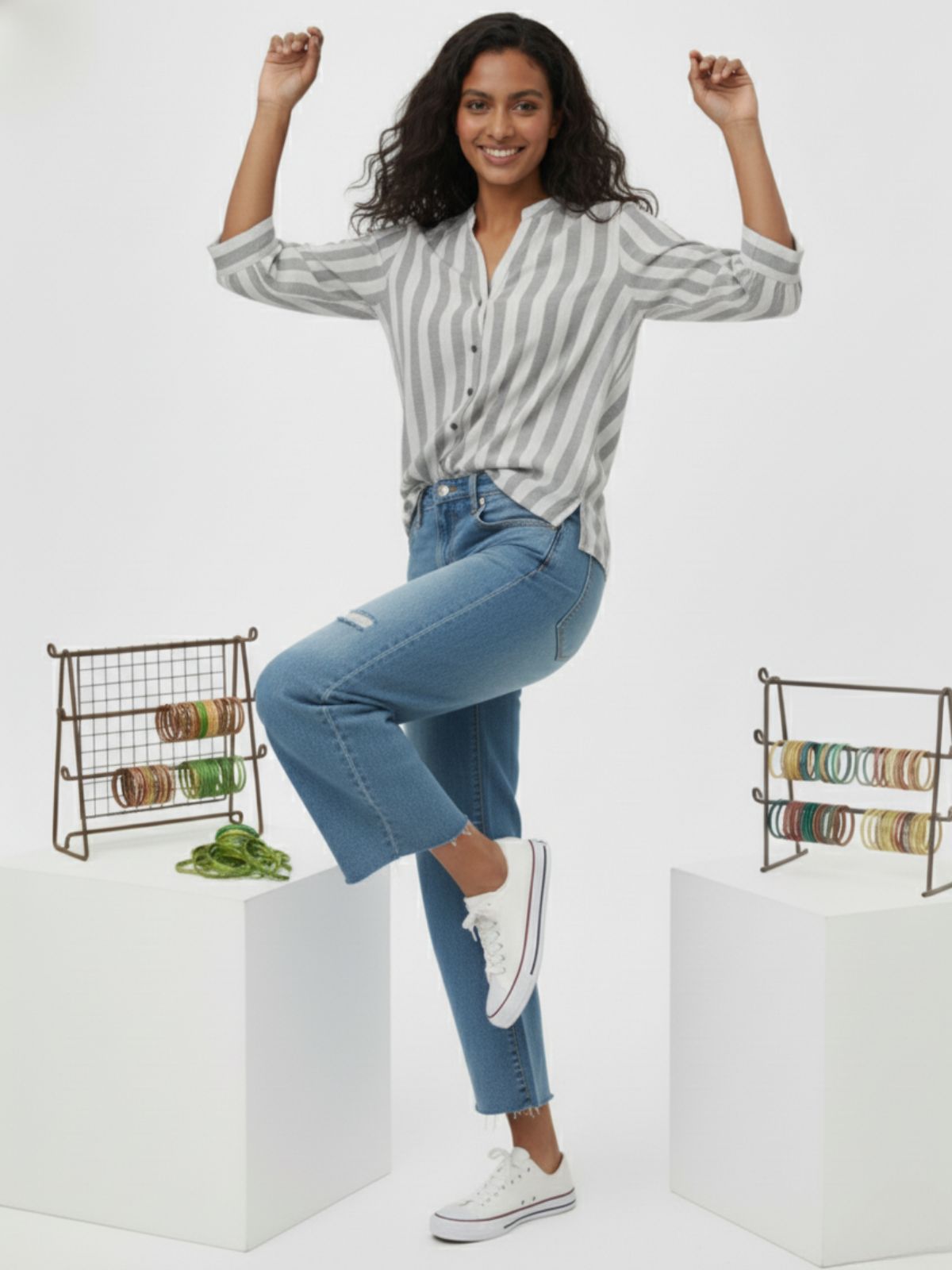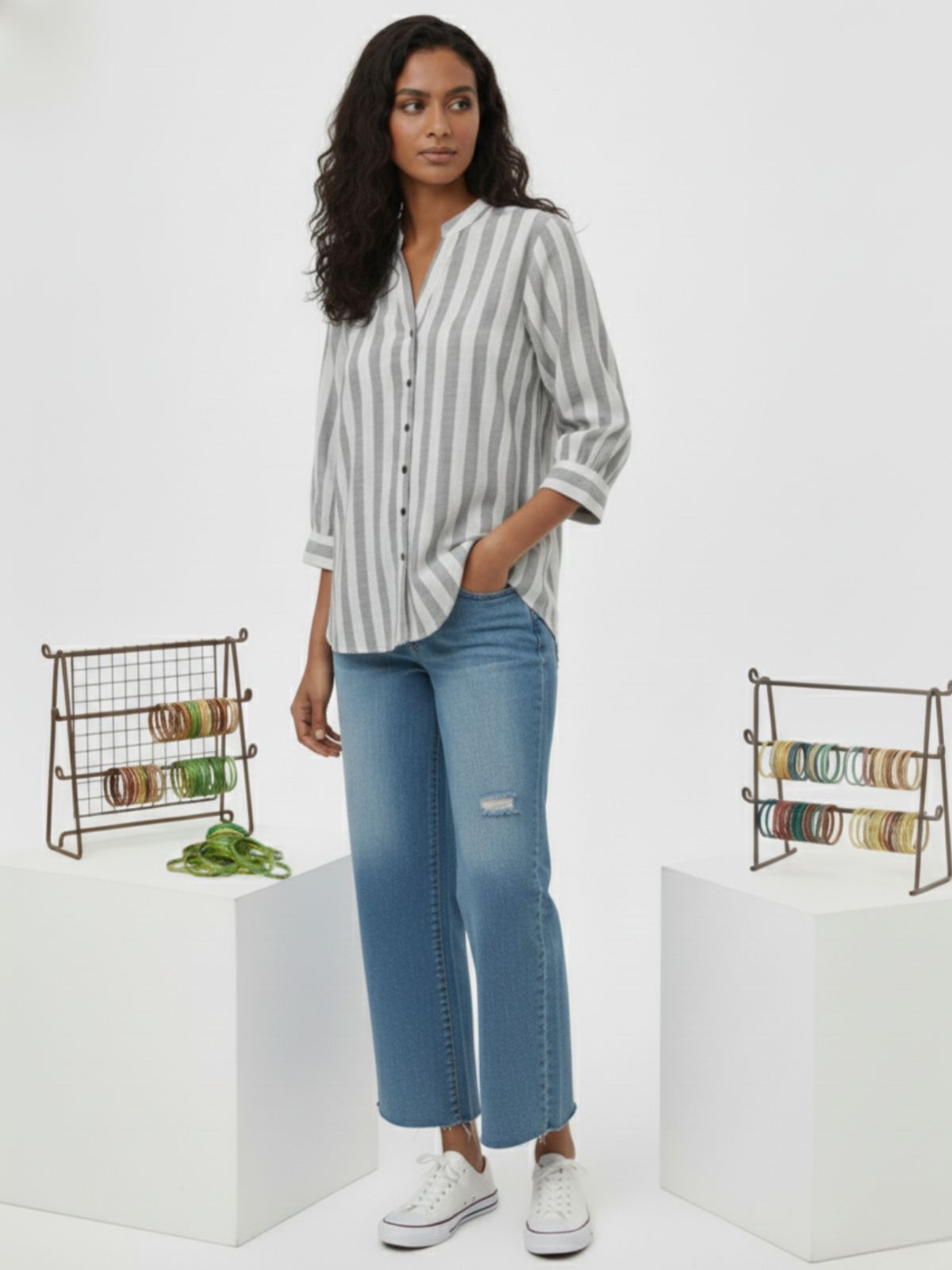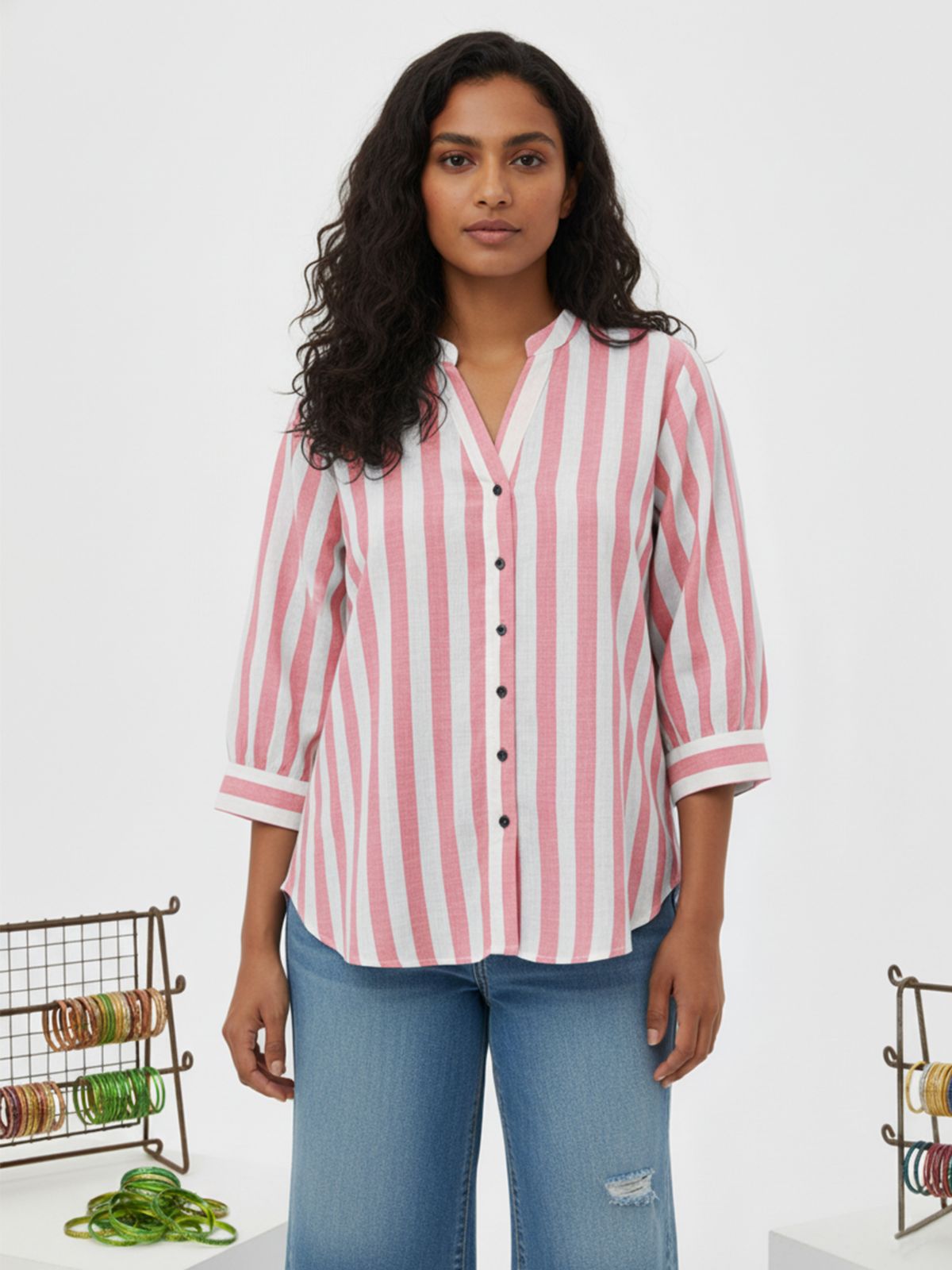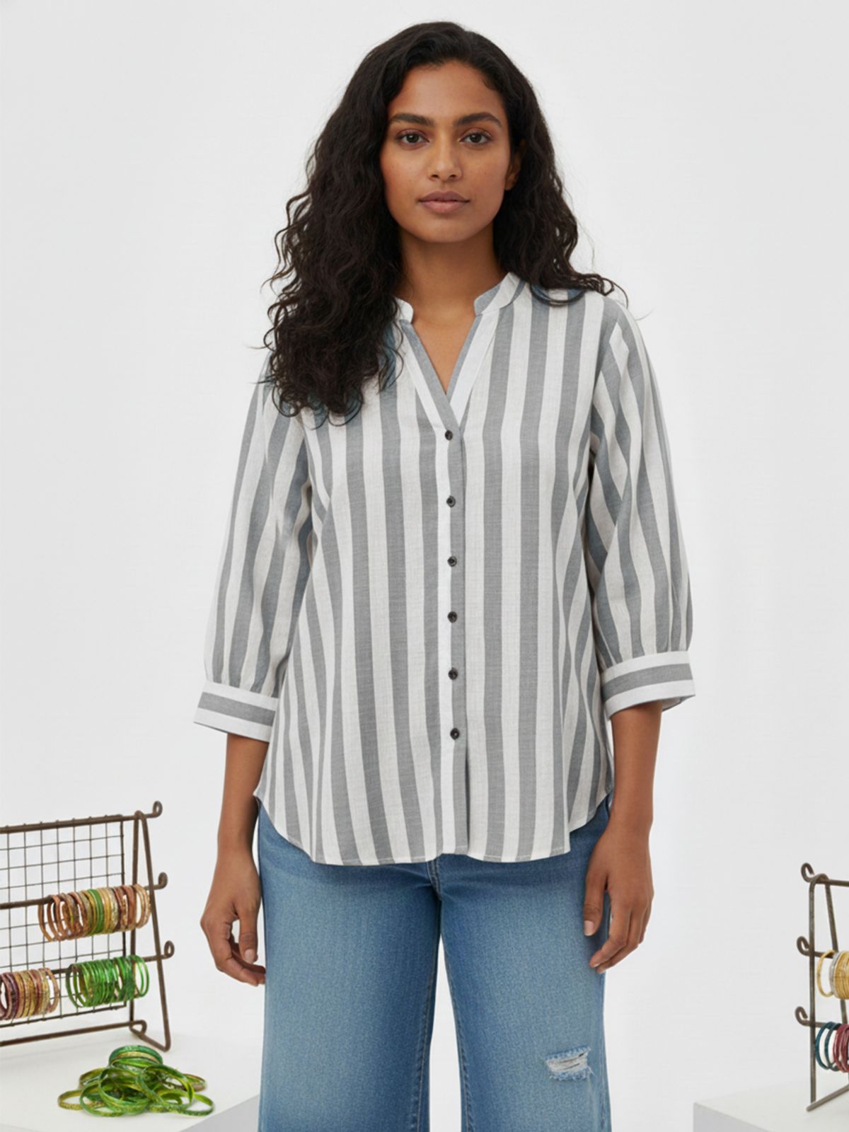 Discover effortless elegance with our Women’s Stripe Shirt featuring stylish shoulder pleats, 3/4th sleeves, and a classic button closure. Designed for both comfort and sophistication, this hip-length shirt offers a flattering fit for any occasion. Crafted from soft, breathable fabric, it blends timeless stripes with modern detailing, making it perfect for office wear or casual outings. Pair it with trousers or jeans for a chic, polished look that enhances your everyday style effortlessly.