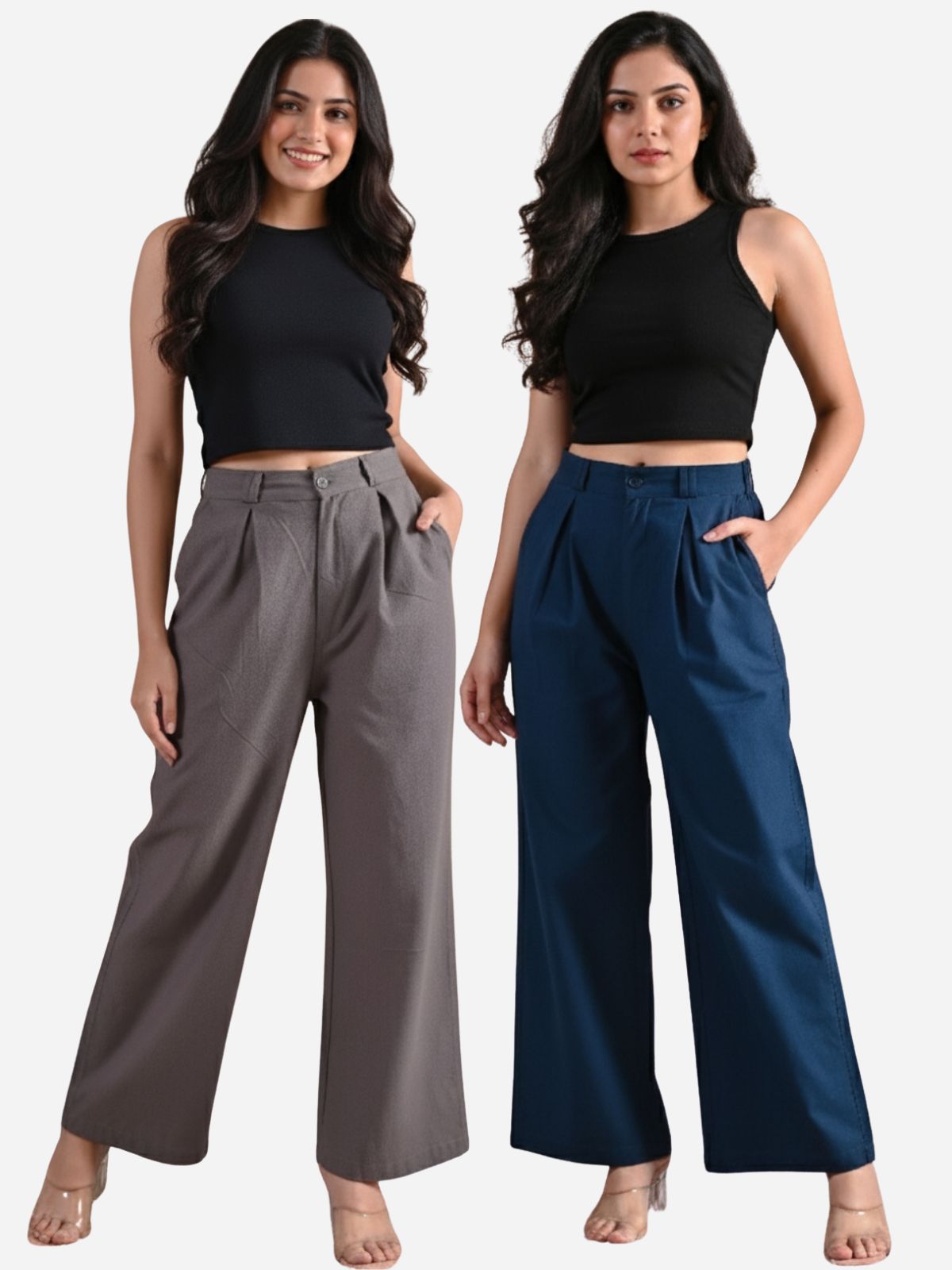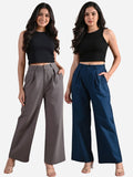 Pack Of 2 Grey And Teal Blue Women Cotton Wide Leg Pants
