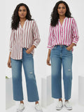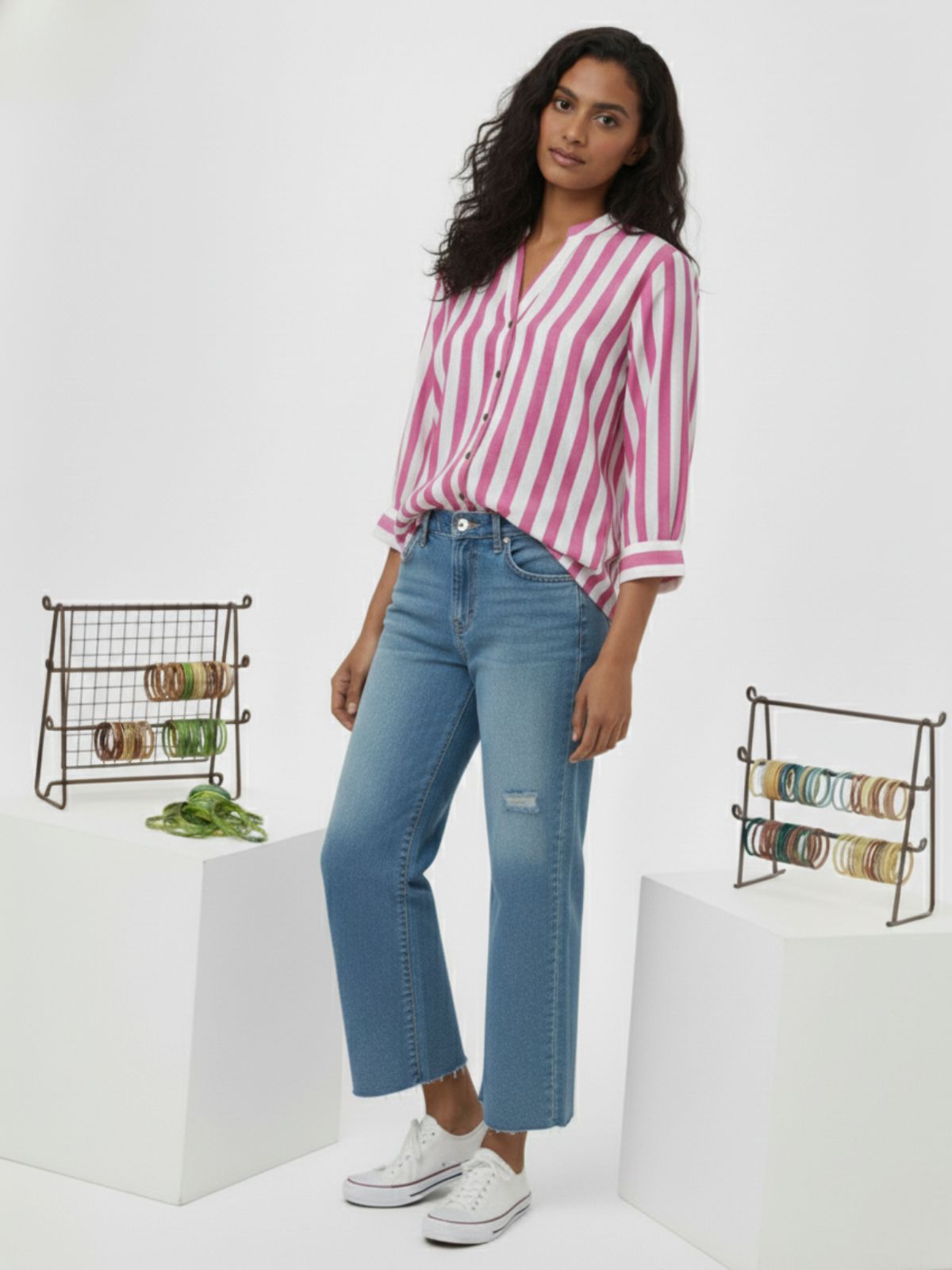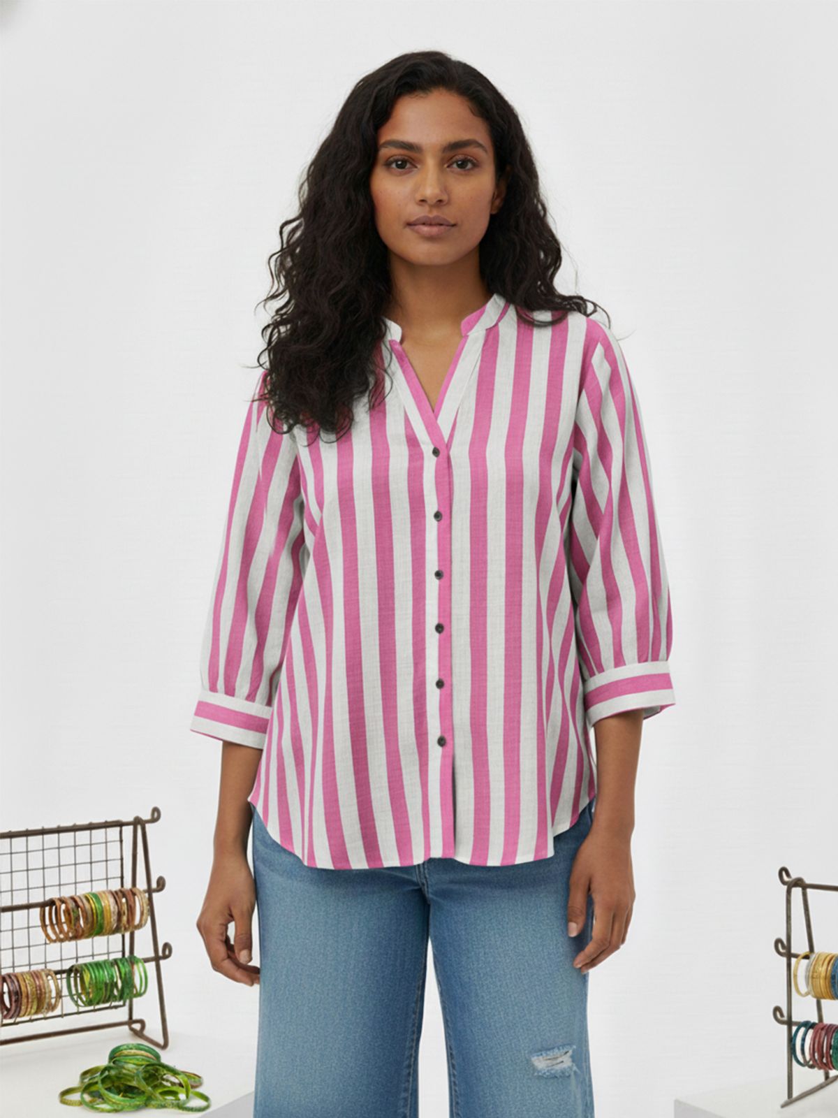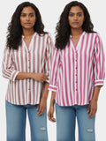 Discover effortless elegance with our Women’s Stripe Shirt featuring stylish shoulder pleats, 3/4th sleeves, and a classic button closure. Designed for both comfort and sophistication, this hip-length shirt offers a flattering fit for any occasion. Crafted from soft, breathable fabric, it blends timeless stripes with modern detailing, making it perfect for office wear or casual outings. Pair it with trousers or jeans for a chic, polished look that enhances your everyday style effortlessly.