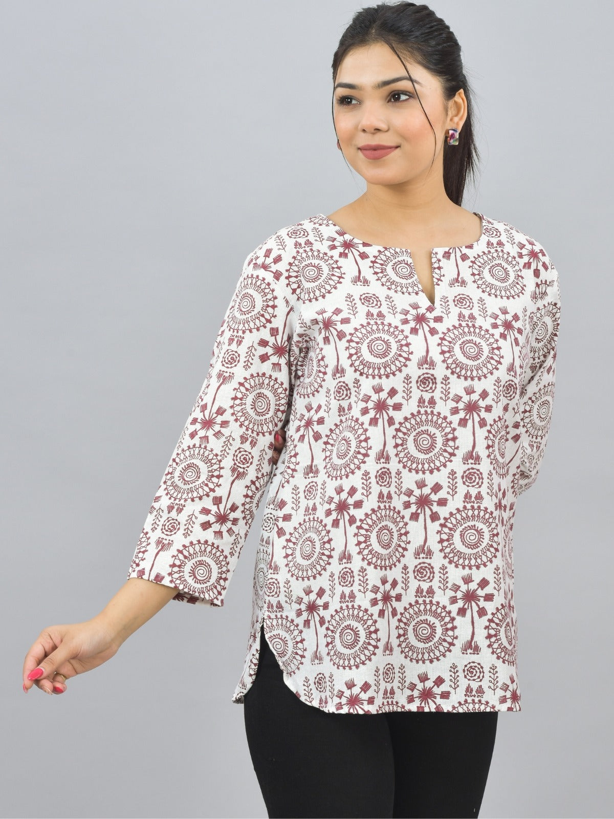 Womens Regular Fit Maroon Tribal Printed Short Kurti/Top