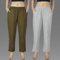 Pack Of 2 Womens Mehndi Green And Melange Grey Deep Pocket Fully Elastic Cotton Trouser