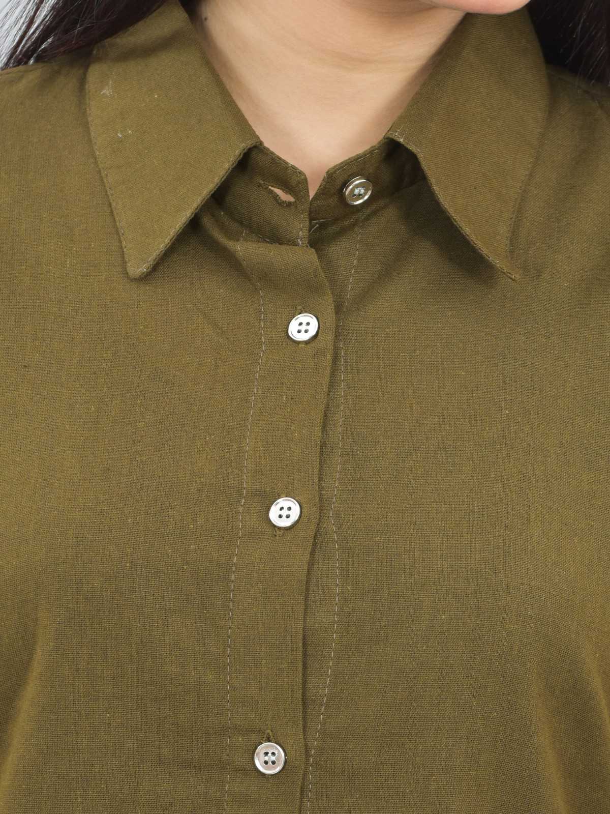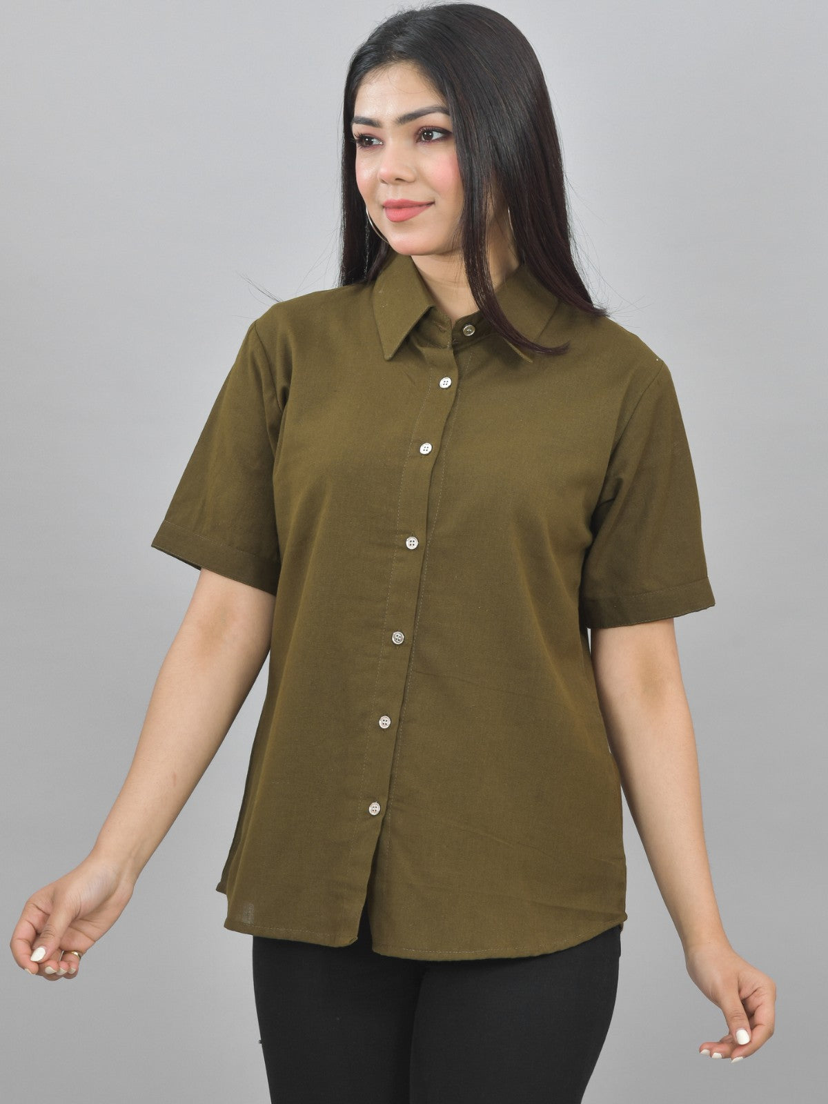 Women Solid Mehendi Green Half Sleeve Spread Collar Cotton Shirt