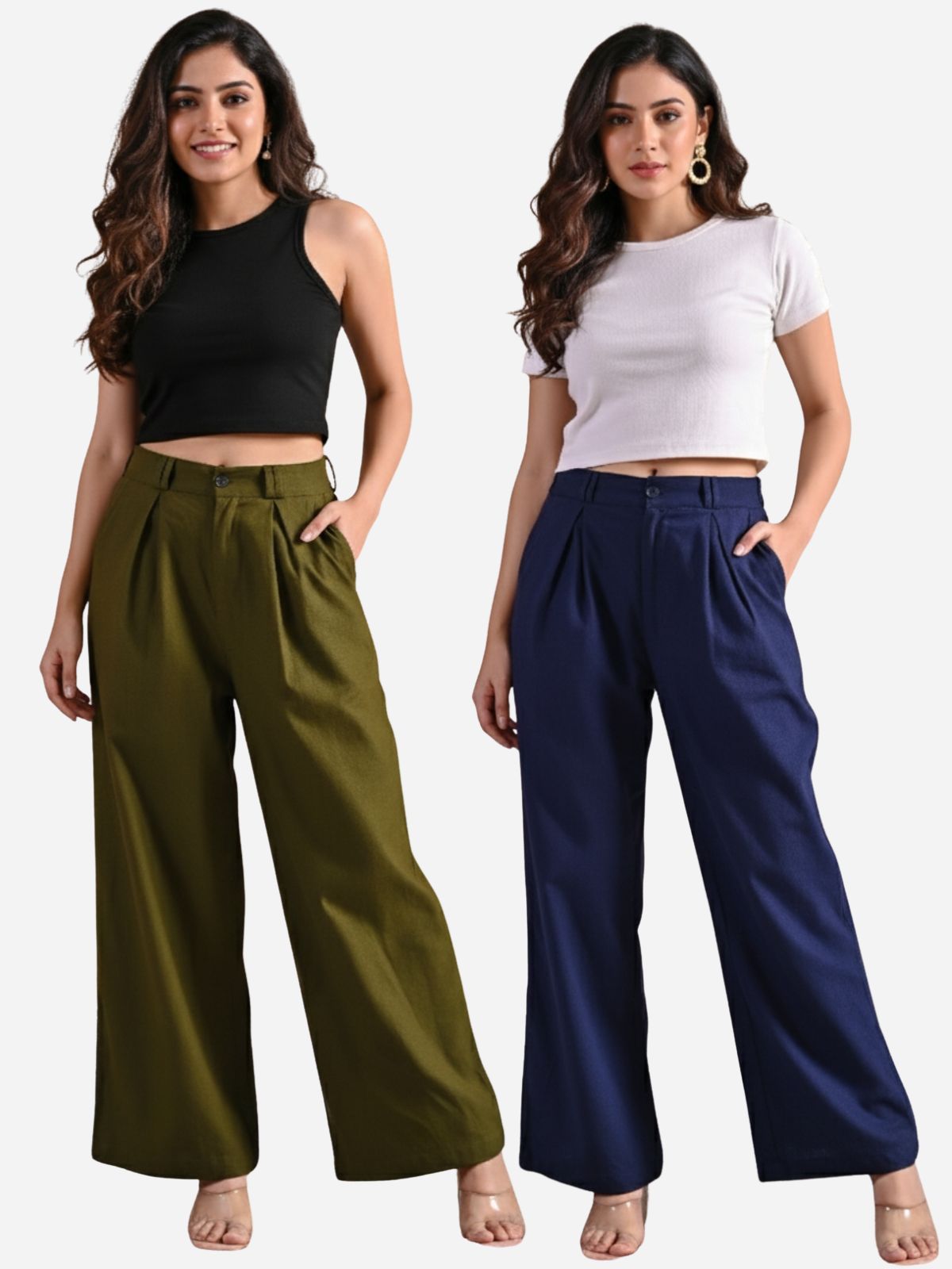 Pack Of 2 Mehendi Green And Navy Blue Women Cotton Wide Leg Pants