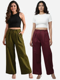 Pack Of 2 Mehendi Green And Wine Women Cotton Wide Leg Pants