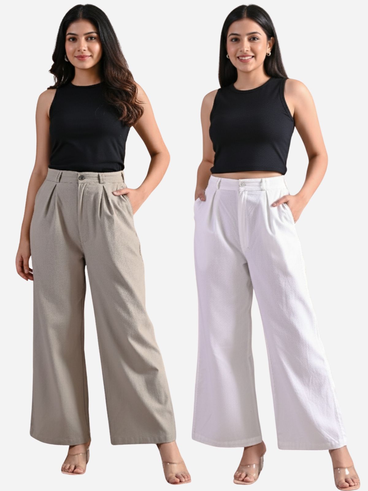 Pack Of 2 Melange Grey And White Women Cotton Wide Leg Pants