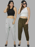 Combo Pack Of Womens Melange Grey And Dark Green Four Pocket Cotton Cargo Pants