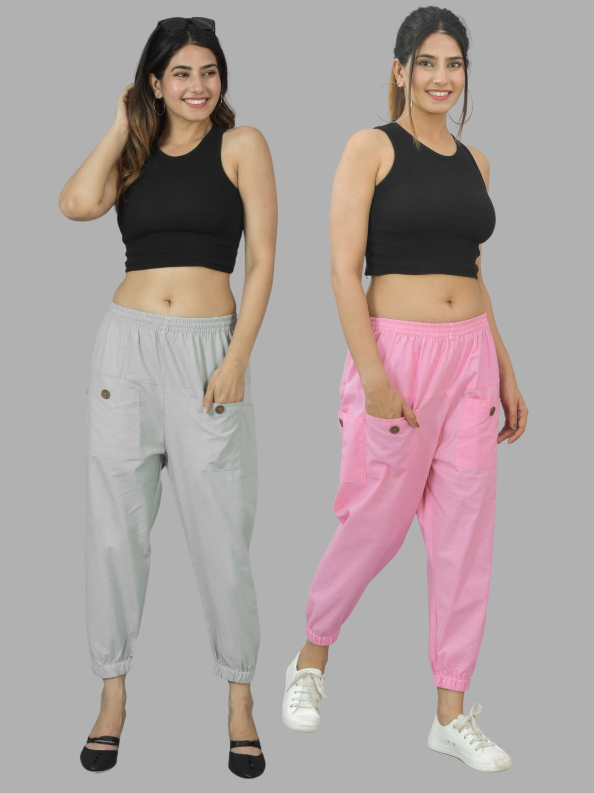 Combo Pack Of Womens Melange Grey And Pink Four Pocket Cotton Cargo Pants